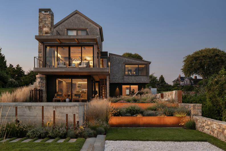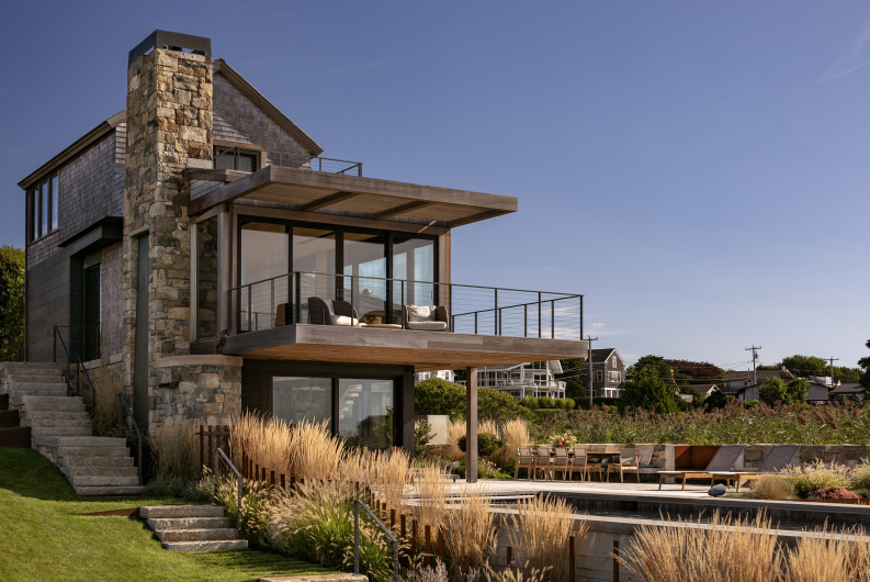 Set in a prominent and active summer community, “Fen’s Edge” is all about utilizing and maximizing the edge condition along the fen, which serves as a threshold between this home and its neighbors. Privacy was critical to the design’s success, as was prioritizing the beautiful beach views. The site itself is located across the main stretch of beach and against a large fen on the north side. The design allows you to park under the primary views of the house with the landscape transitioning along the side of the pool, up to the front door and into the home. The home also includes a small terrace, pool and Zen garden nestled below the fen, allowing tall phragmites to create additional privacy, with an isolated view toward the ocean. Inside the courtyard is an outdoor shower that breaks through a side wall and is cantilevered over the natural vegetation, creating an experience fully immersed within the landscape. The home’s garden level integrates into the pool design, with the upper section intended to “float” above the fen when seen from across the way. This technique makes the house look smaller and consistent with the scale of other homes in the neighborhood.