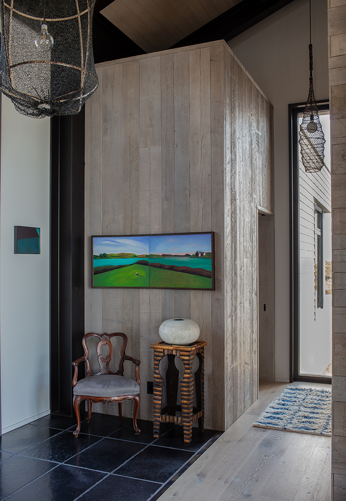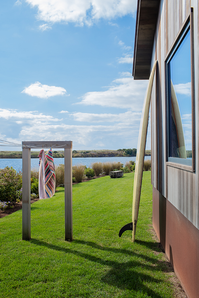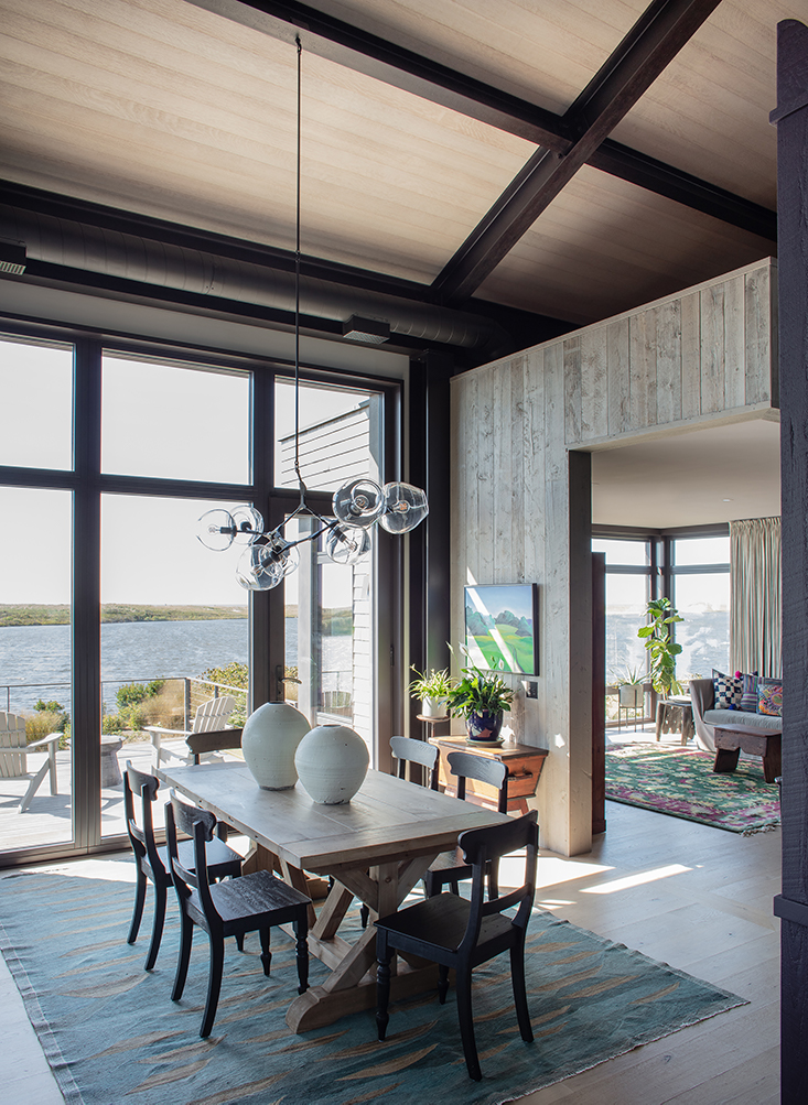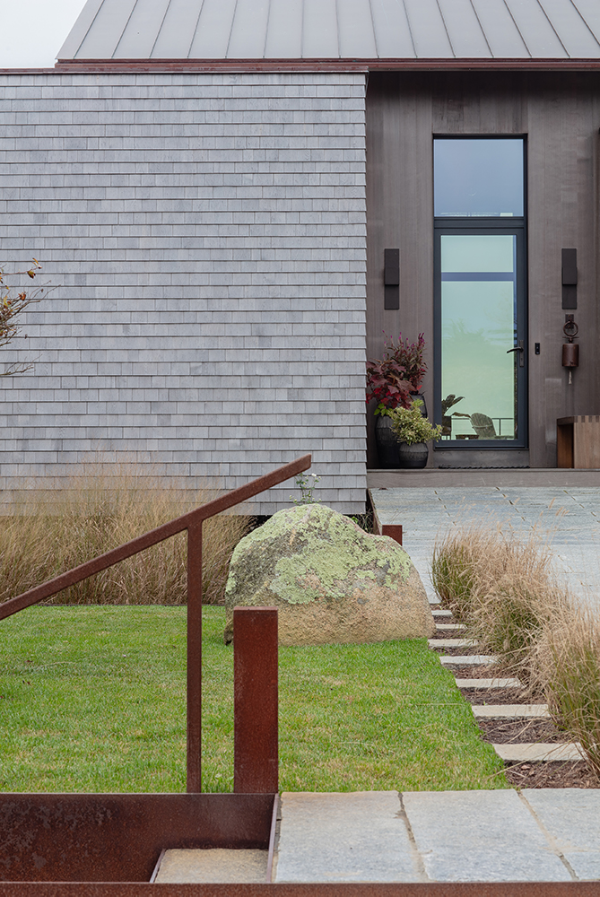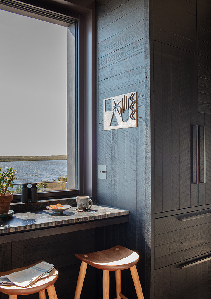 Nestled forward on a waterfront site and fitting within strict wetland setbacks, this Martha’s Vineyard home strikes the perfect balance between maintaining a strong connection to its natural setting and maximizing privacy from neighboring properties. The main house is elevated five feet above the floodplain, allowing native vegetation to migrate up to and under the house. Visually and experientially, this feature creates a sense of floating, as movement within the grasses below create views straight through to the horizon. The desire for a compact, comfortable, and resilient home led the homeowners to pursue and exceed Passive House requirements. The Passive House Institute US places an extraordinary emphasis on indoor air quality, resilience, and an unparalleled indoor environment. With a robust solar electric system inclusive of battery storage, this home can operate entirely independent from the grid and use of fossil fuels, and generates enough surplus power that the homeowners can allocate extra to their adult children who live across town.