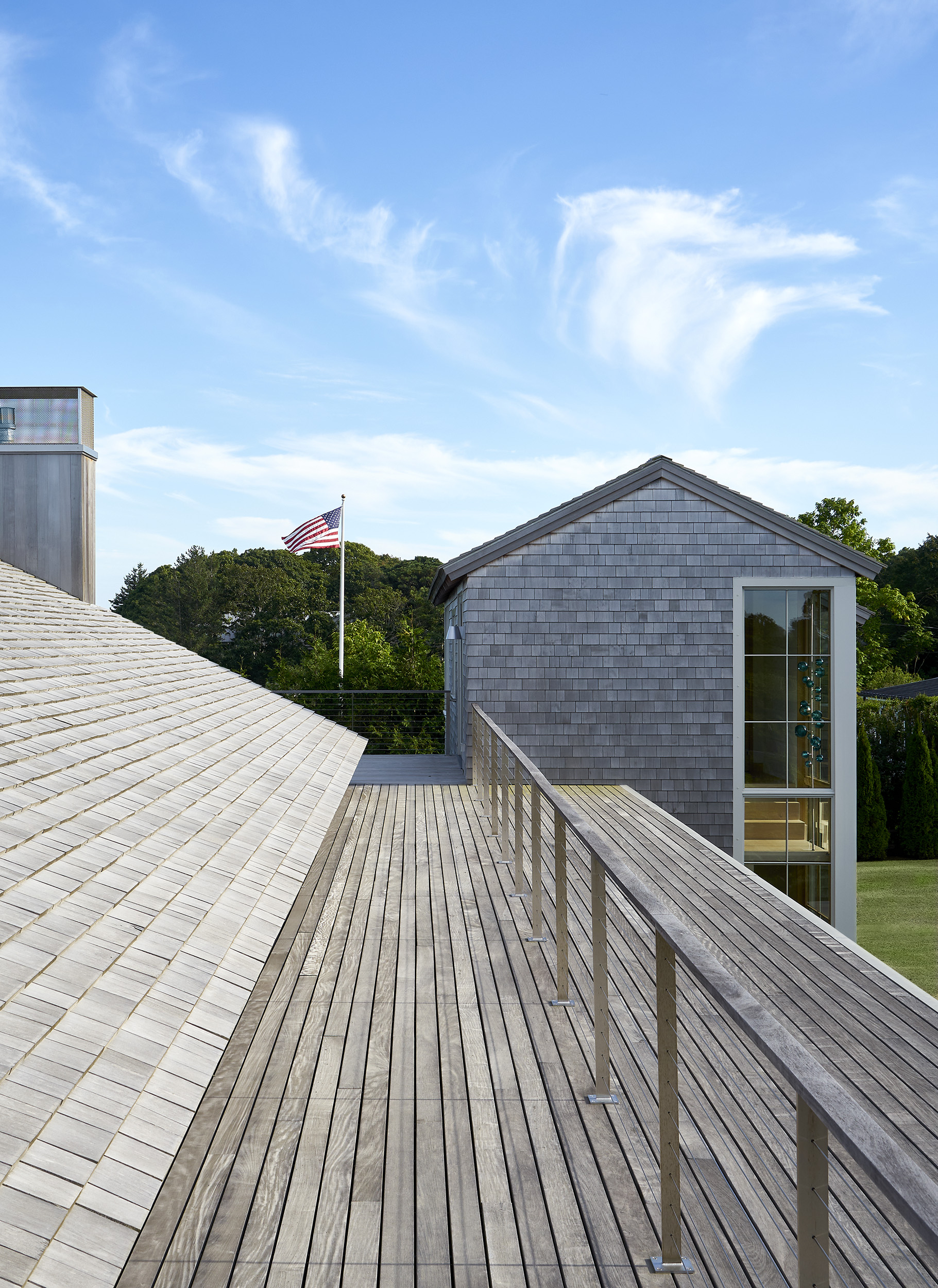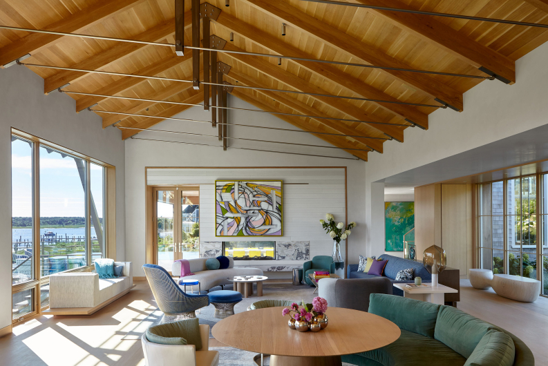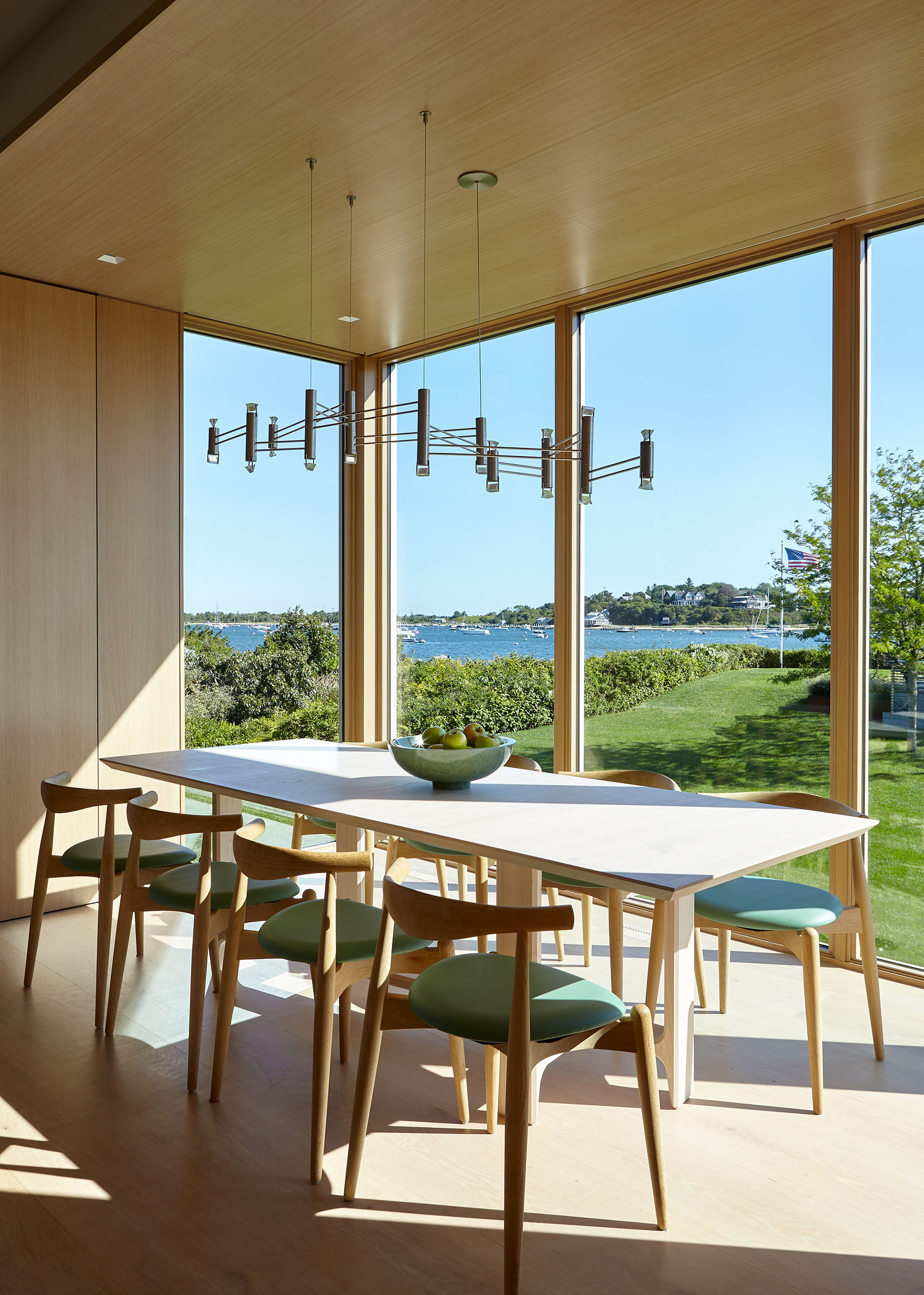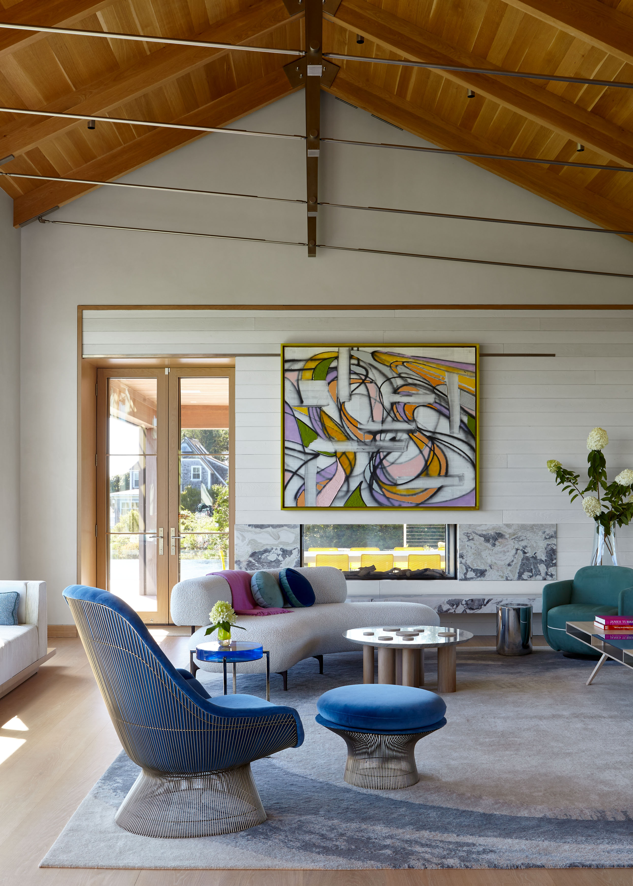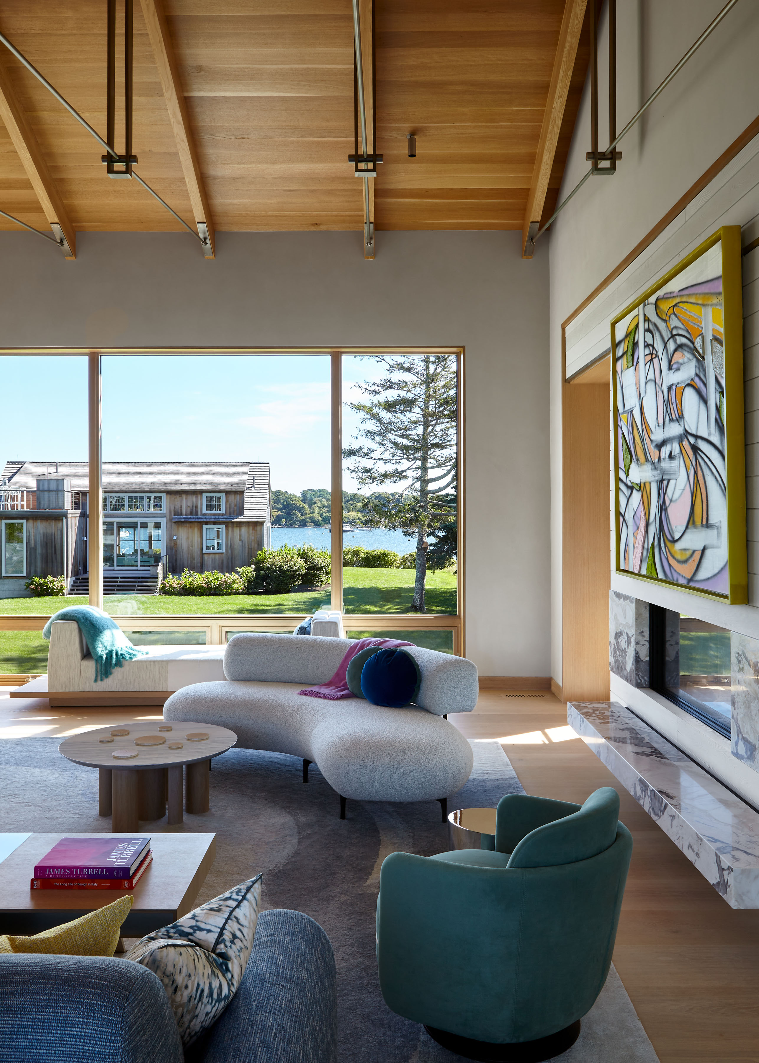 The main house is dedicated to entertaining an extended network of family and guests. Four “primary” suites extend to the corners, while a great room, kitchen and sitting room are centrally located with access to the main level pool deck. The life room includes a large, vaulted ceiling with asymmetrical “saltbox” roof form and two-sided fireplace opening onto the screened porch. Across the lawn, the cottage was re-imagined as a detached primary suite, granting the homeowners both autonomy and immediate engagement with the sea beyond. “Bluff Cottage” provides everything the homeowners might need when they are visiting alone or retreating from the day’s activities, while the main house provides amenities of a boutique inn, with large spaces for cooking, gathering, work and celebration – all with the privacy and convenience of its adjacent location, as well as access to activities along the shoreline, where an existing boathouse was refurbished to provide yet another layer of waterfront hospitality.