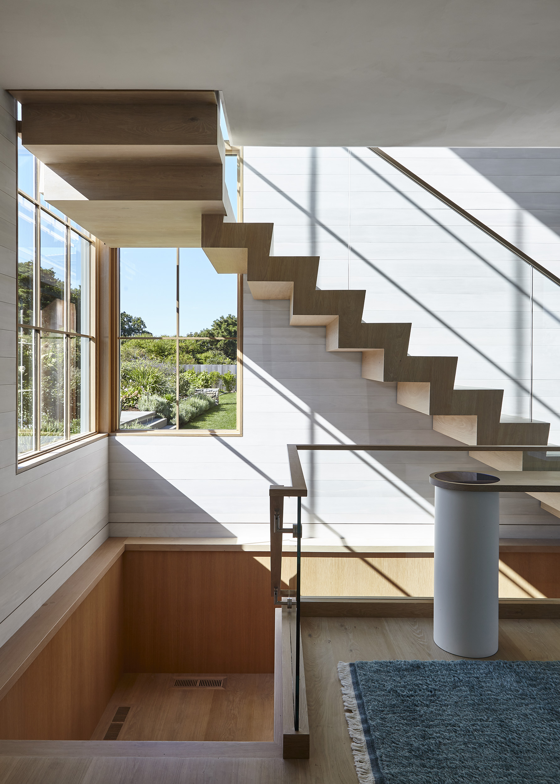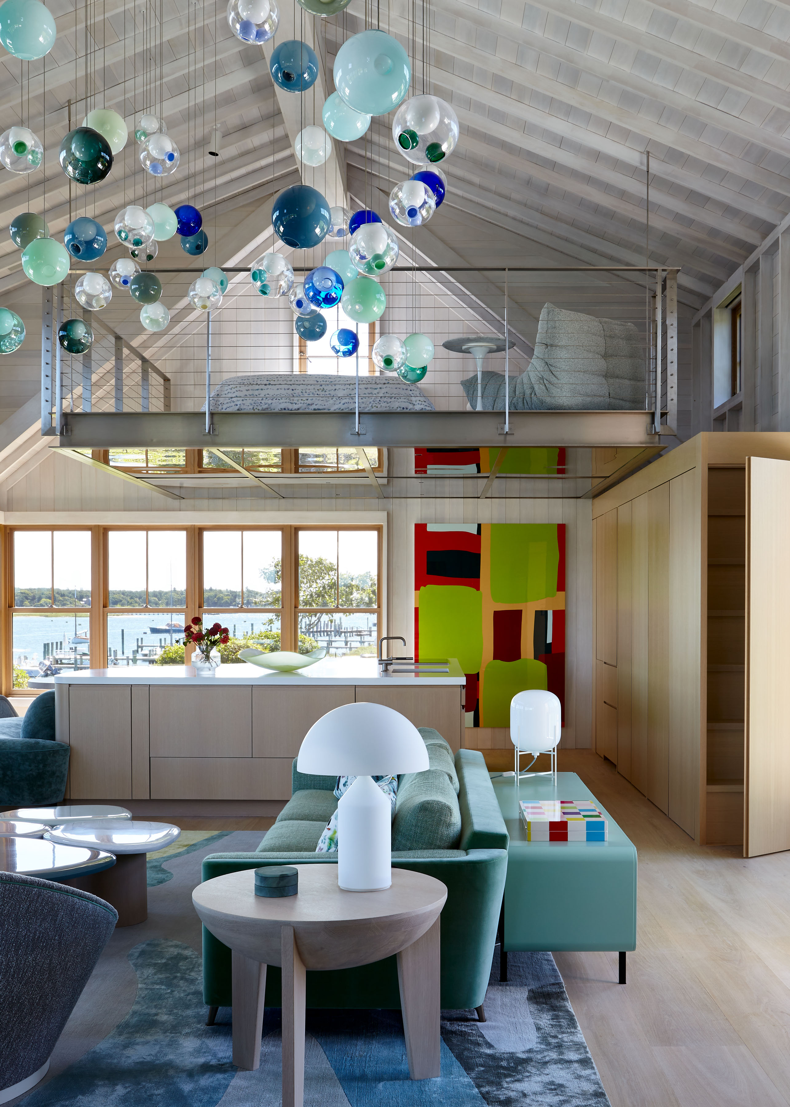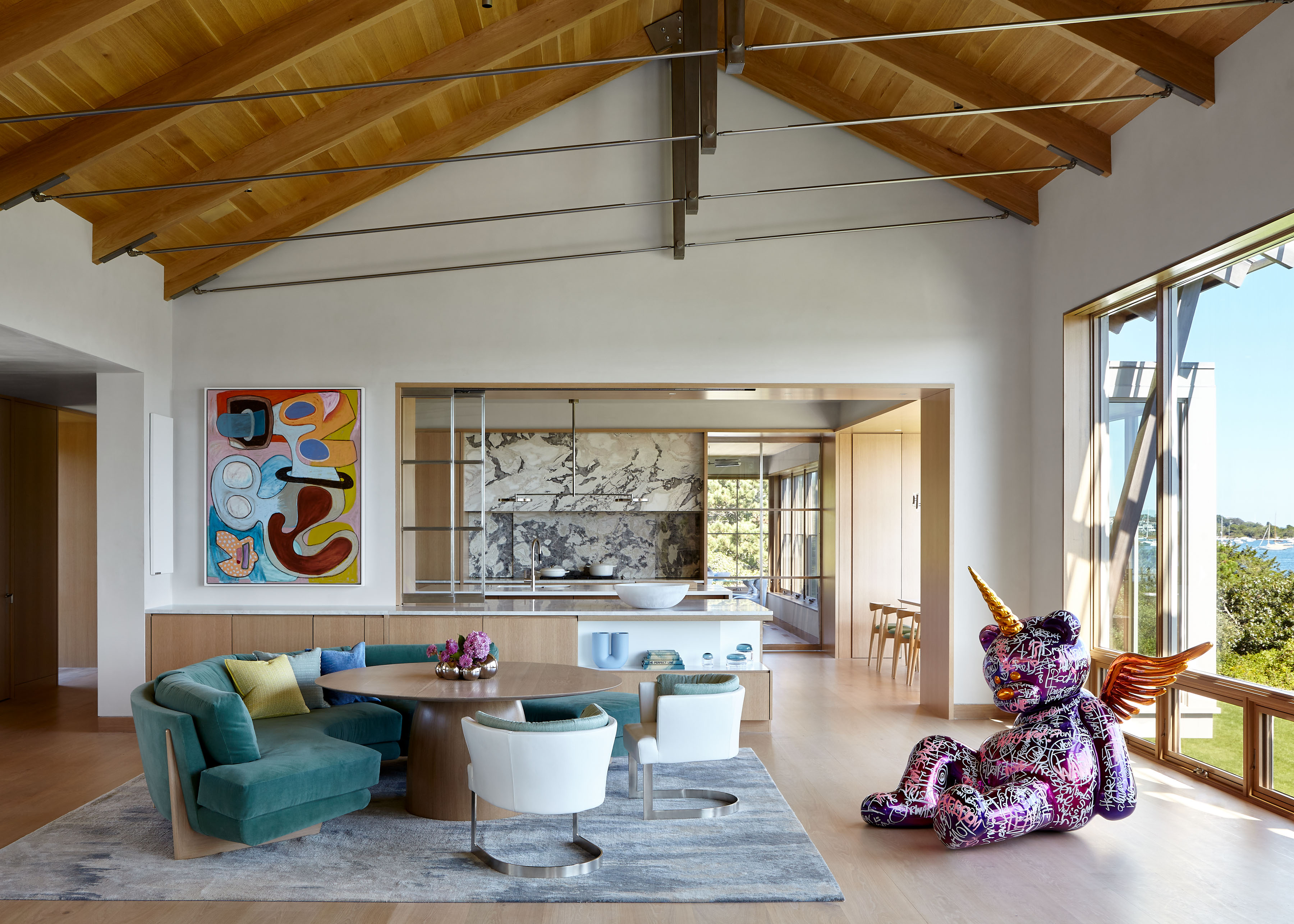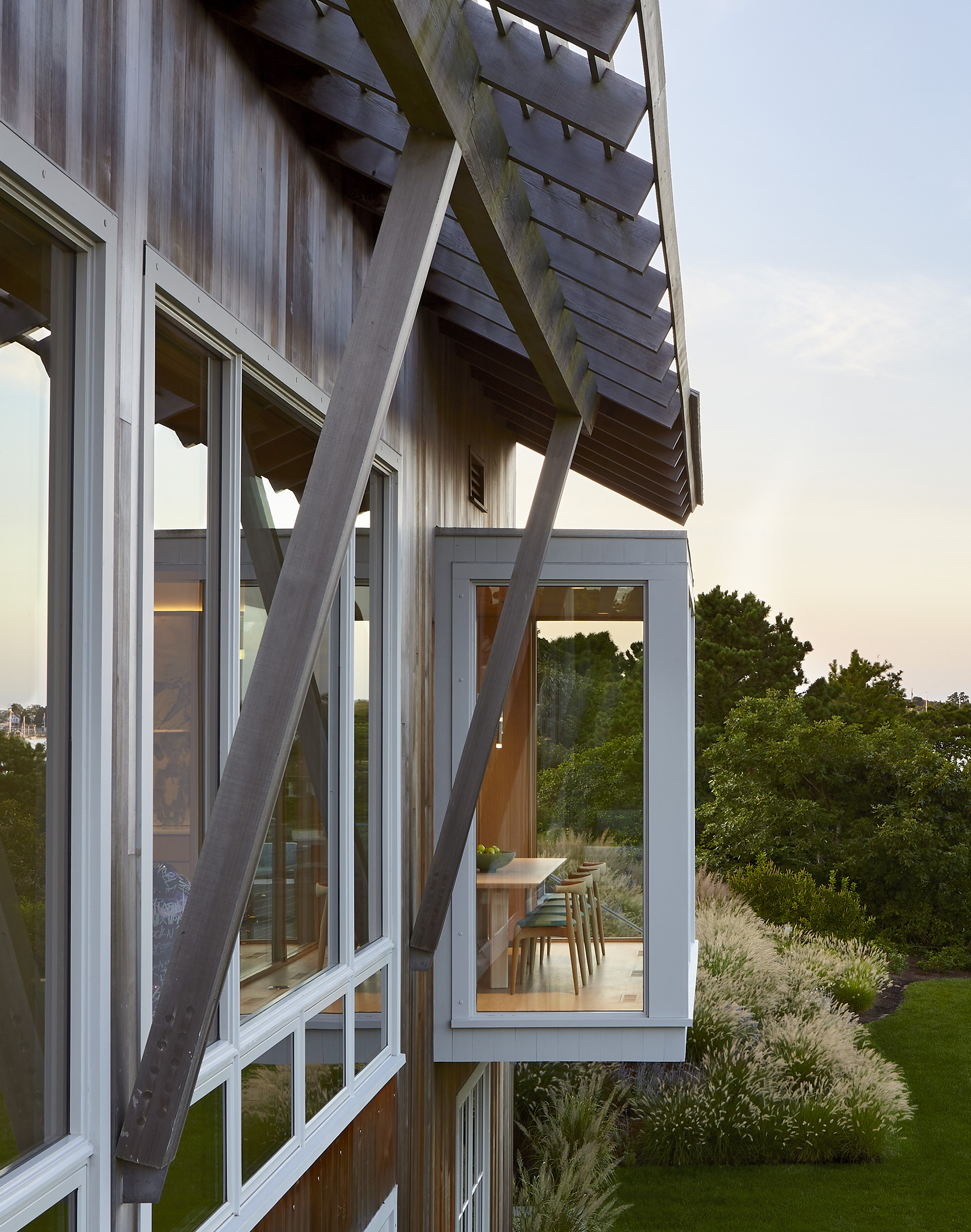 The main house is dedicated to entertaining an extended network of family and guests. Four “primary” suites extend to the corners, while a great room, kitchen and sitting room are centrally located with access to the main level pool deck. The life room includes a large, vaulted ceiling with asymmetrical “saltbox” roof form and two-sided fireplace opening onto the screened porch. Across the lawn, the cottage was re-imagined as a detached primary suite, granting the homeowners both autonomy and immediate engagement with the sea beyond. “Bluff Cottage” provides everything the homeowners might need when they are visiting alone or retreating from the day’s activities, while the main house provides amenities of a boutique inn, with large spaces for cooking, gathering, work and celebration – all with the privacy and convenience of its adjacent location, as well as access to activities along the shoreline, where an existing boathouse was refurbished to provide yet another layer of waterfront hospitality.