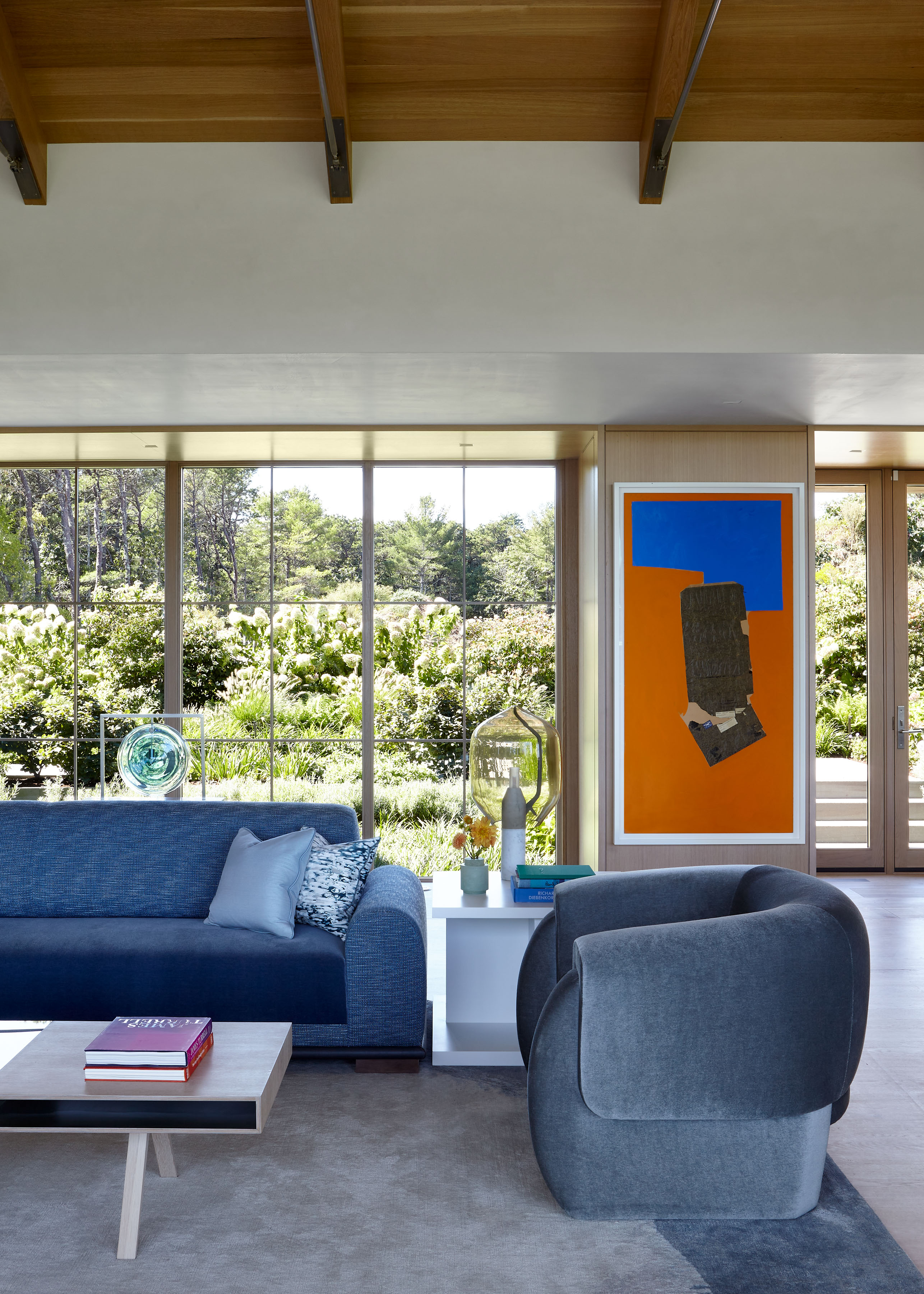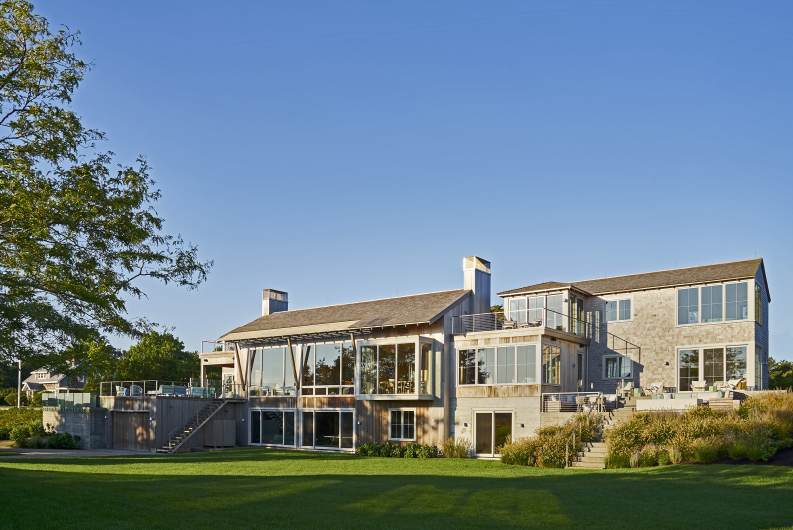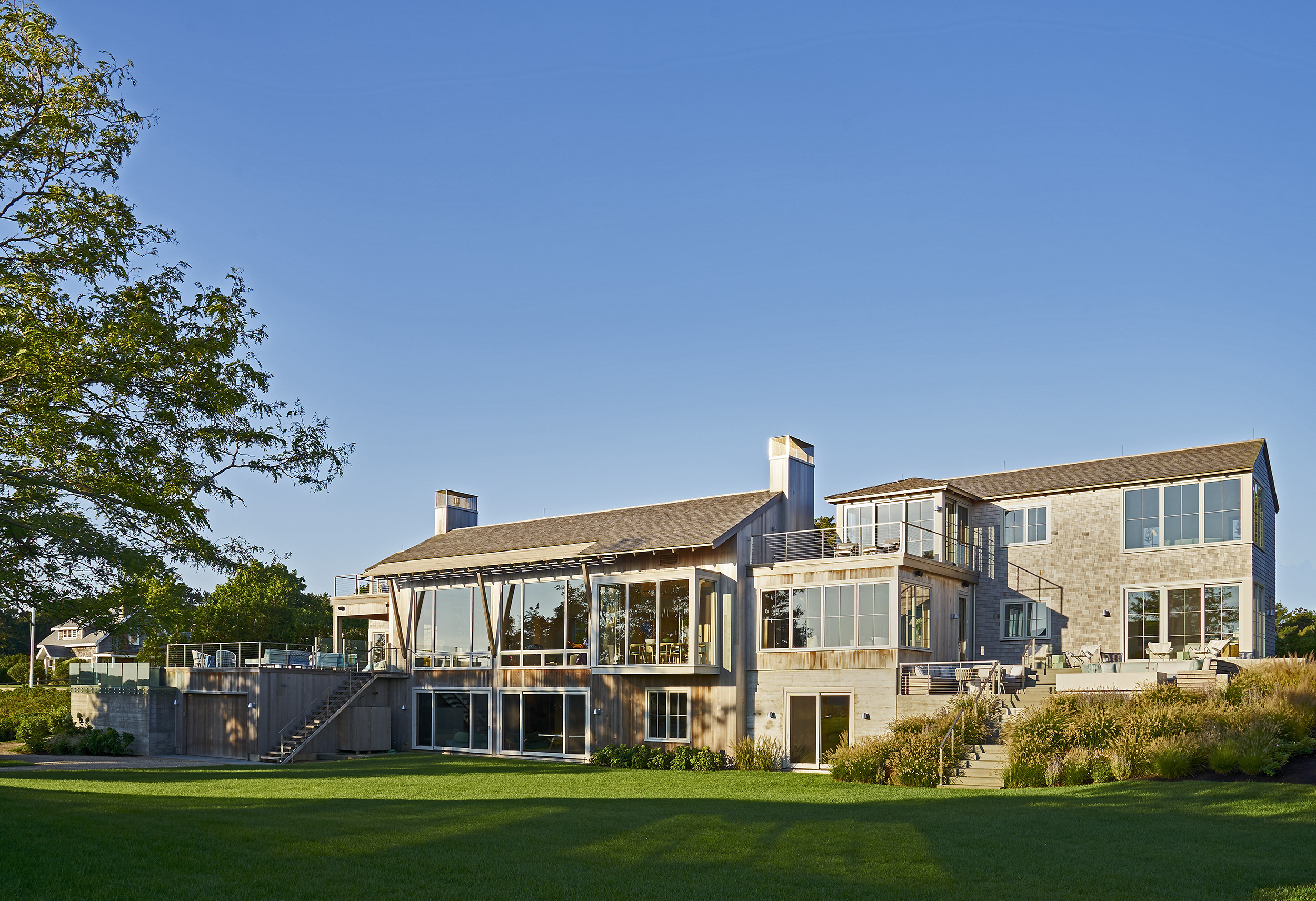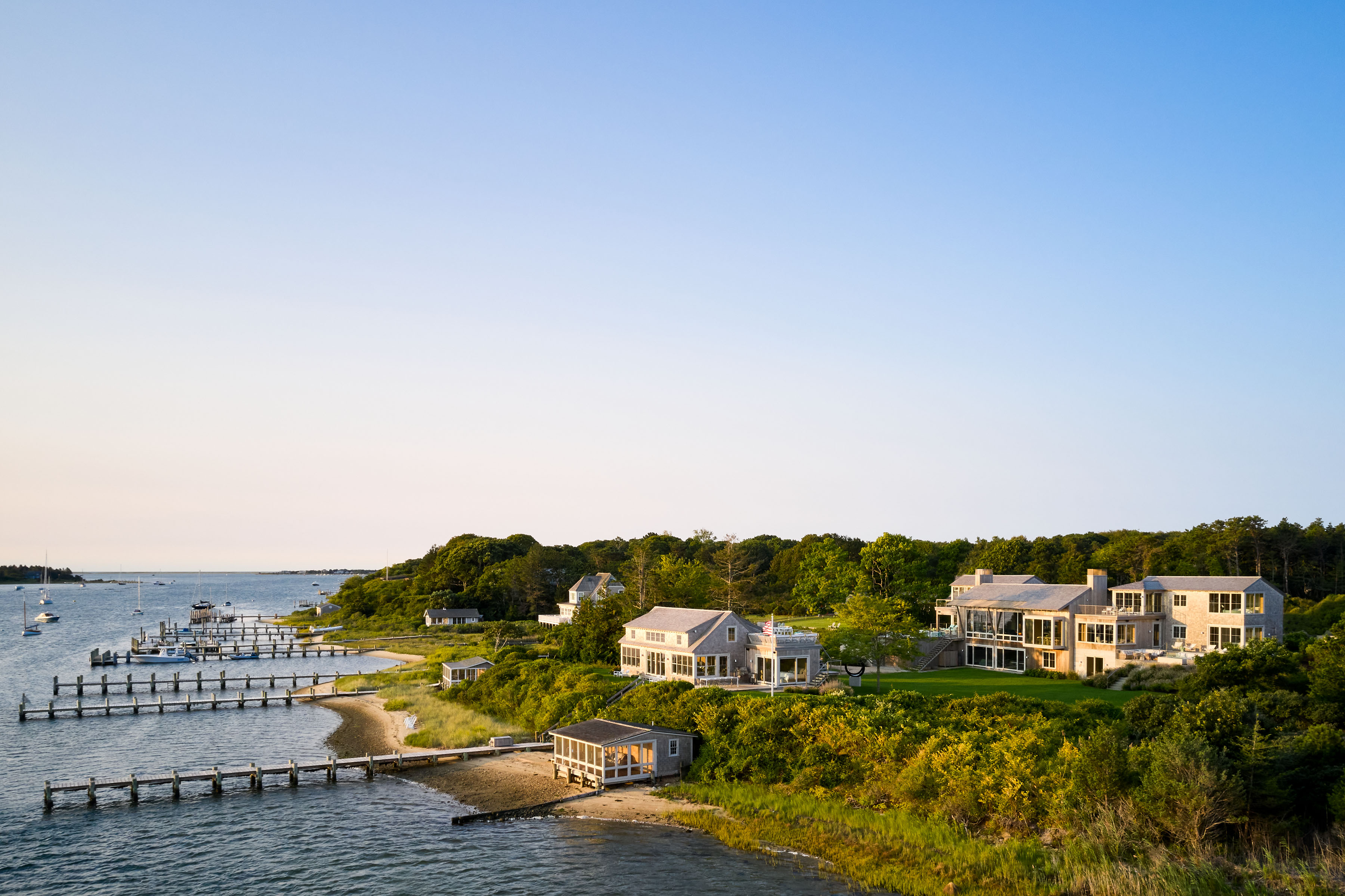 The homeowners of this waterfront site aimed to create a family compound, serving as a summer getaway for both older and younger generations. Complete with boat dock and ample space to spread out, their desired retreat, comprised of two primary structures, flips the typical orientation of the main house and guest house, with its smaller “Bluff Cottage” built directly on the view.