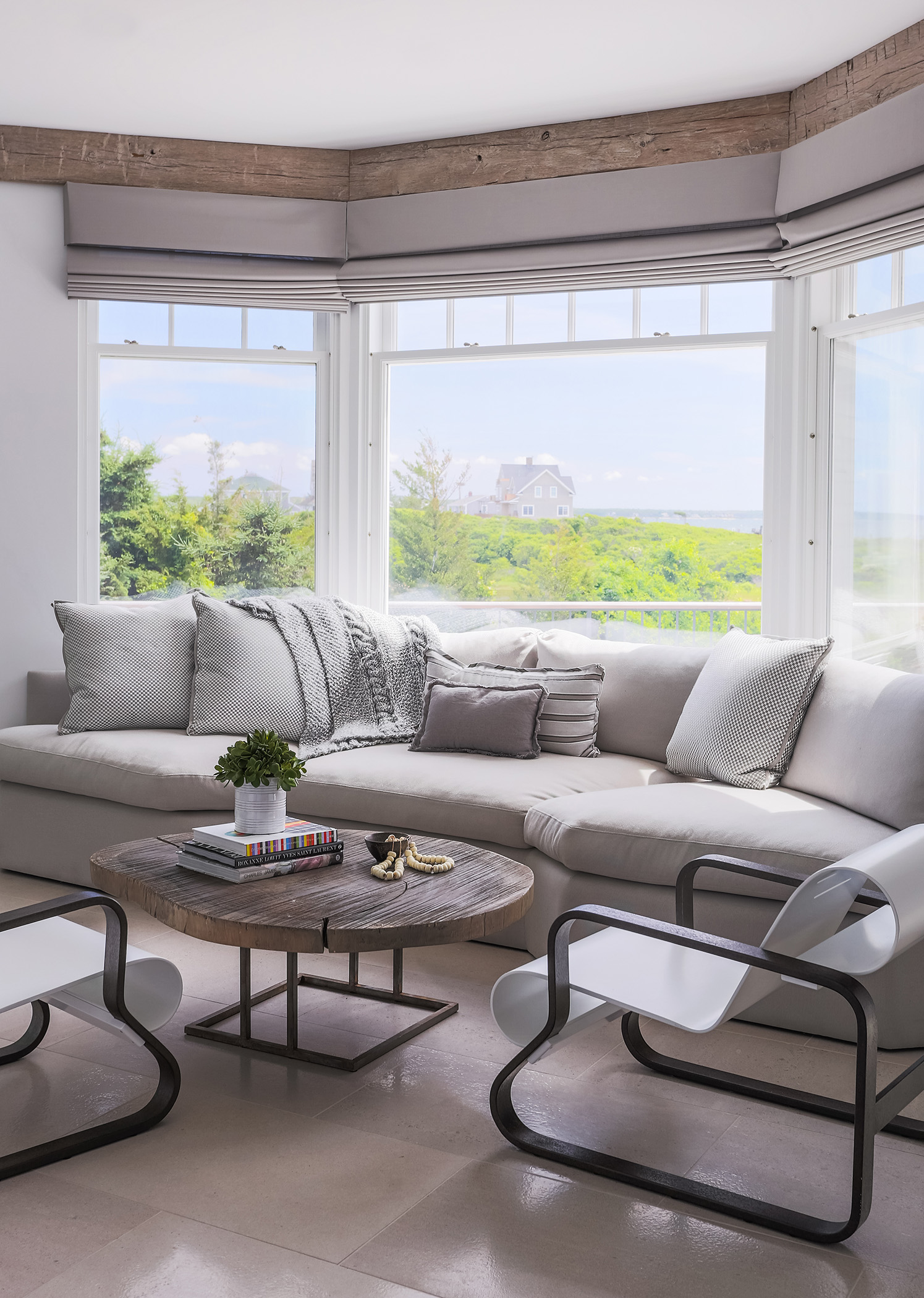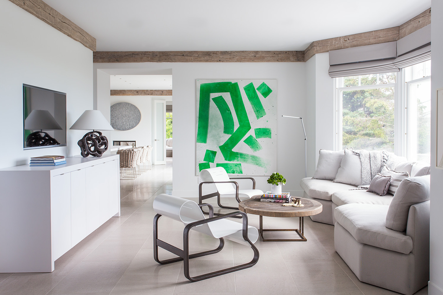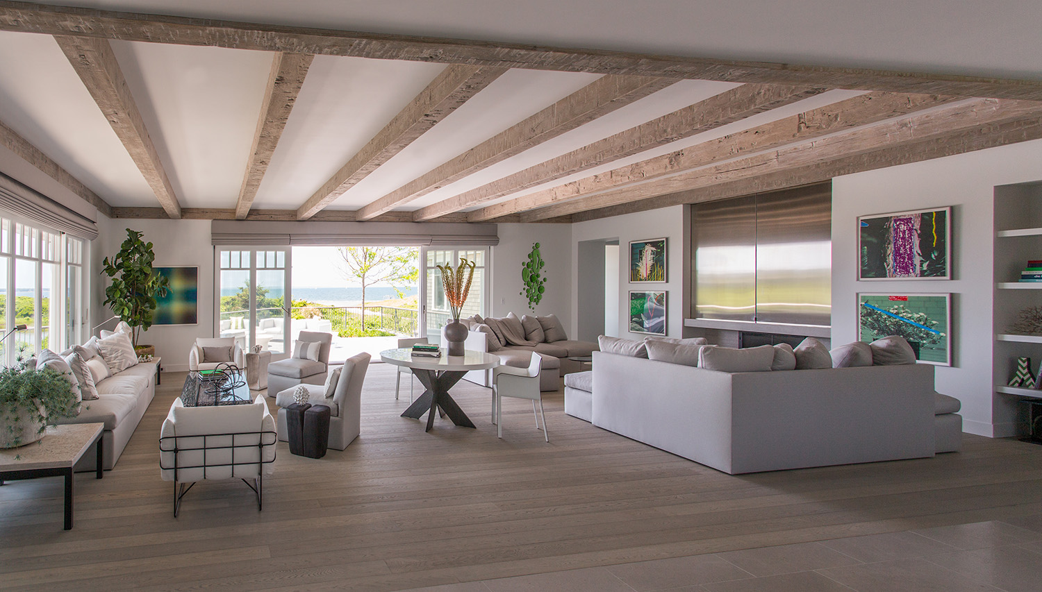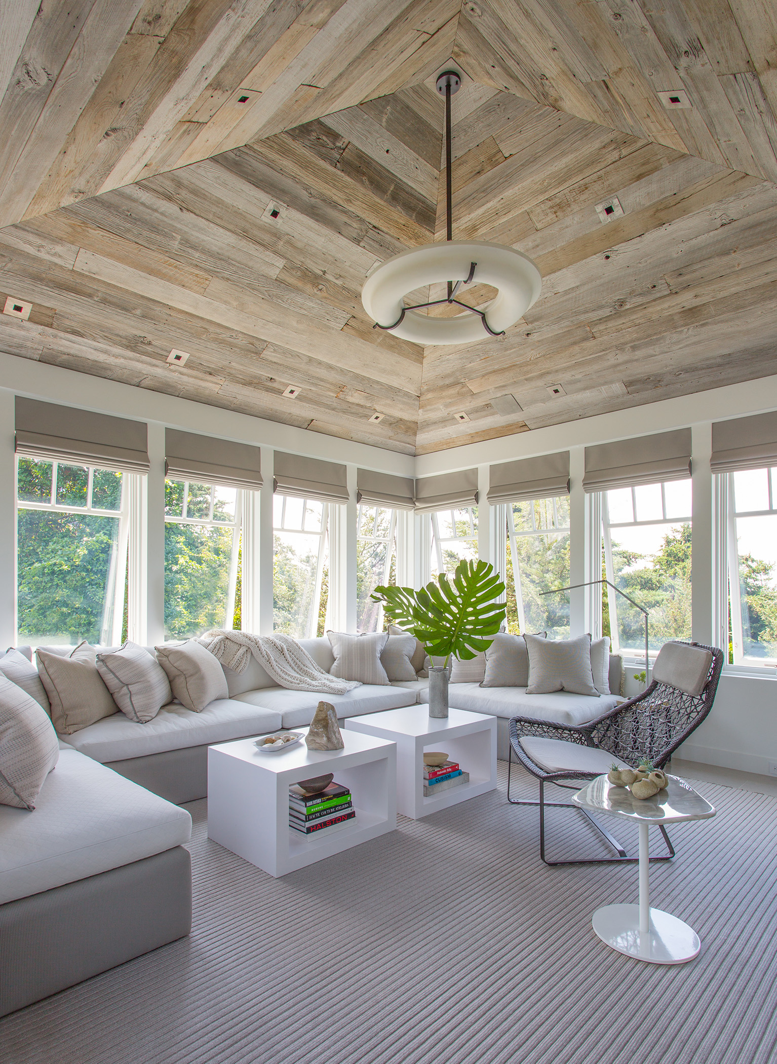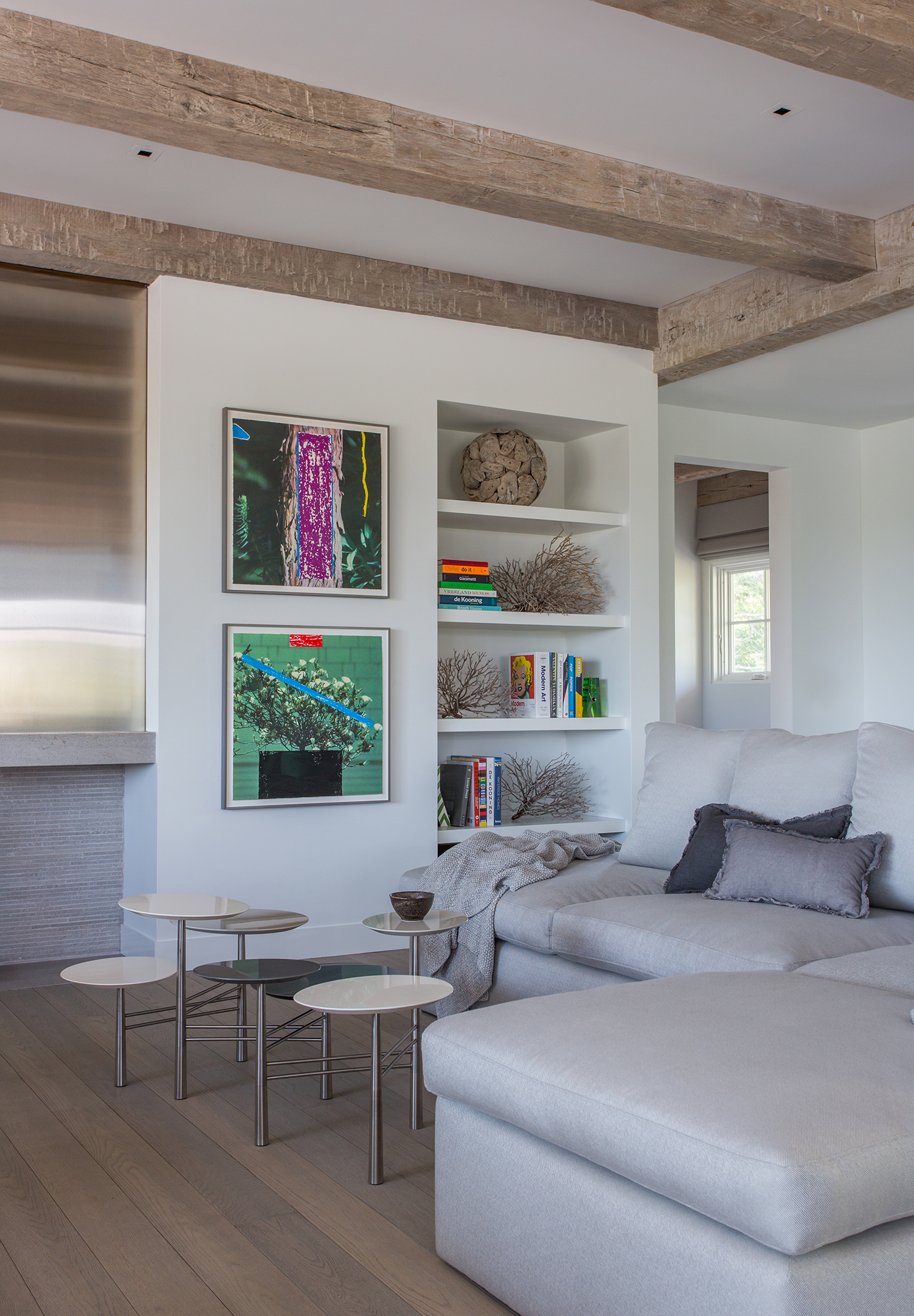 This homeowner wished for a house that spoke to the local Shingle Style tradition, but also felt open and comfortable for entertaining. Hutker Architects conceived a gambrel structure with two wings (one for family bedrooms and one for guests) arranged around a large central living area. Cottage style windows connect with historic homes in the area, inviting light from all four directions, while contemporary interior touches create an atmosphere suited to the family’s incredible modern art collection and active lifestyle.