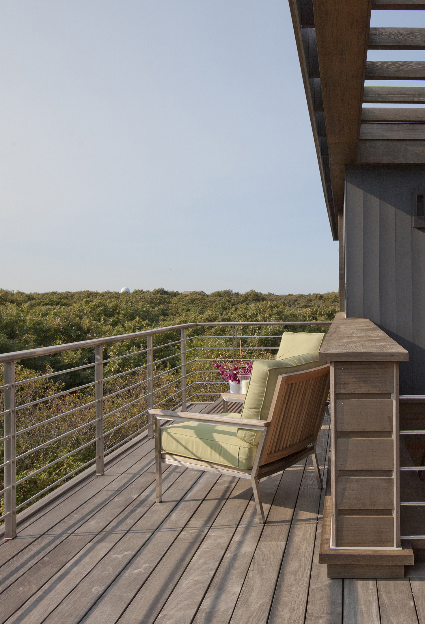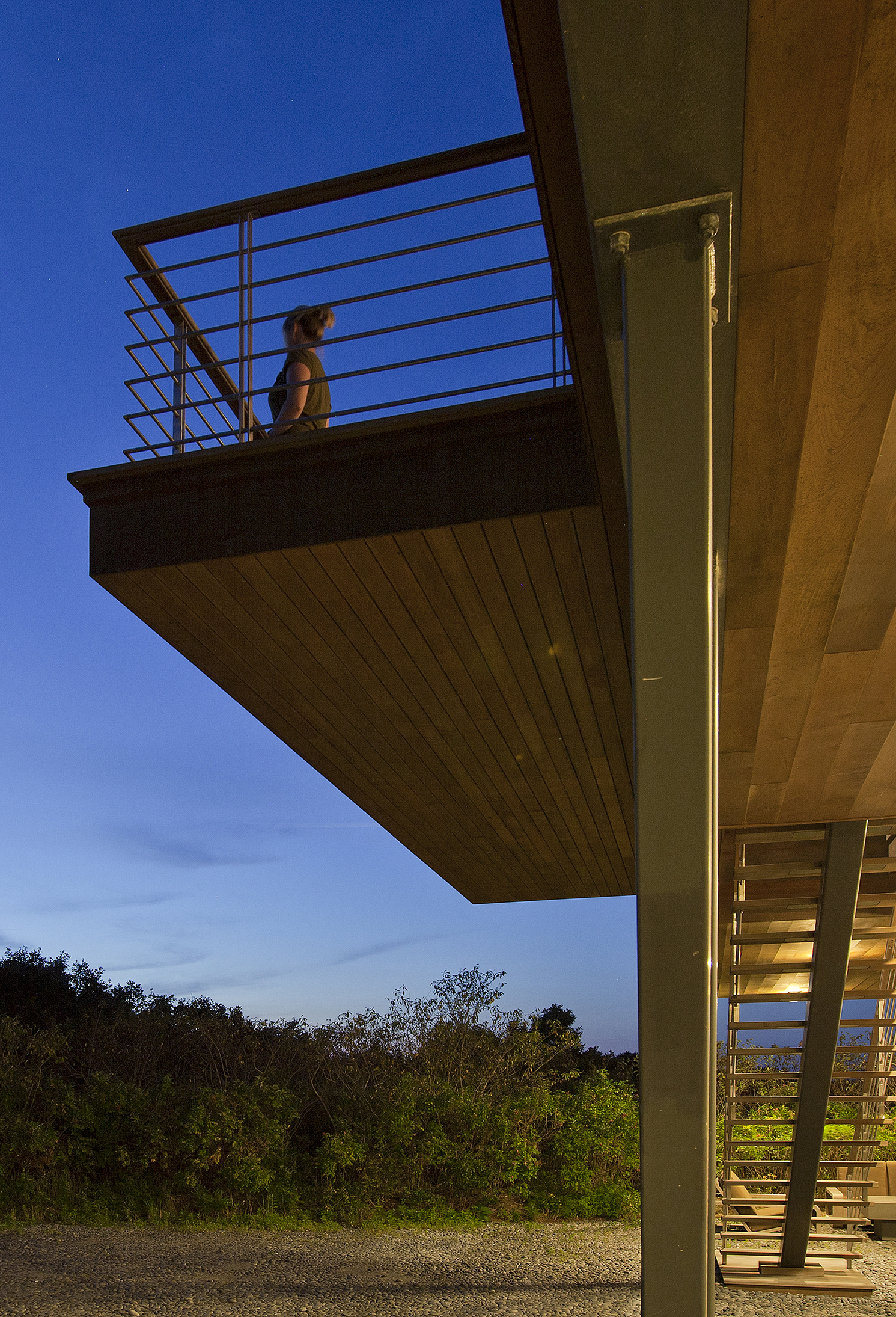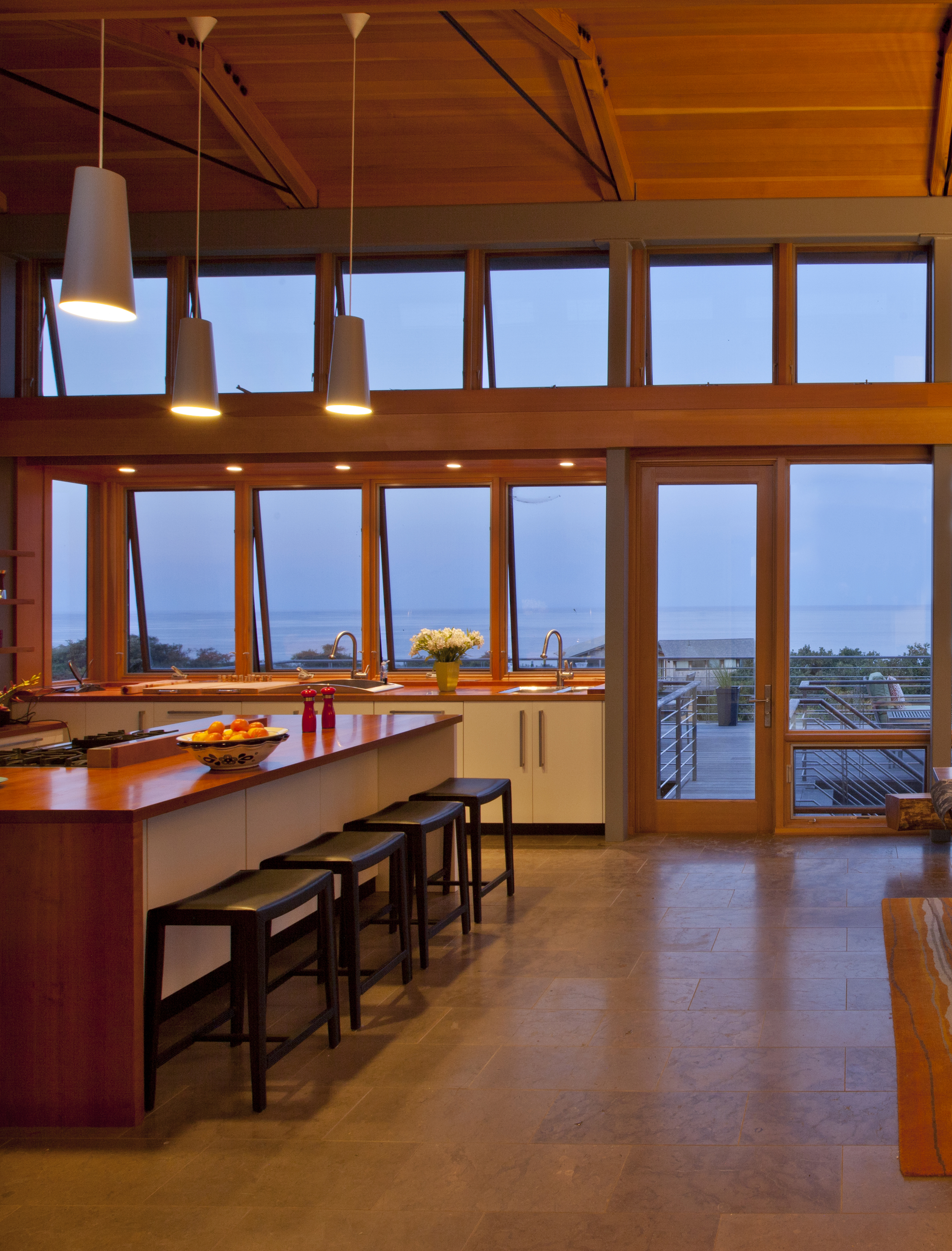 For this property hugging a cliff some 140 feet above the Atlantic, the client asked for a “tree house” – a structure set above the canopy of oaks and foliage – with an unobstructed ocean view. The home is zoned into three parallel linear volumes, clad largely in naturally weathered boards, glass, and copper. A long deck, inspired in form by a pontoon outrigger, is connected to the house by three bridges. The design elegantly weaves the legacy of midcentury modern architecture with the romance of the Cape Cod maritime tradition.
