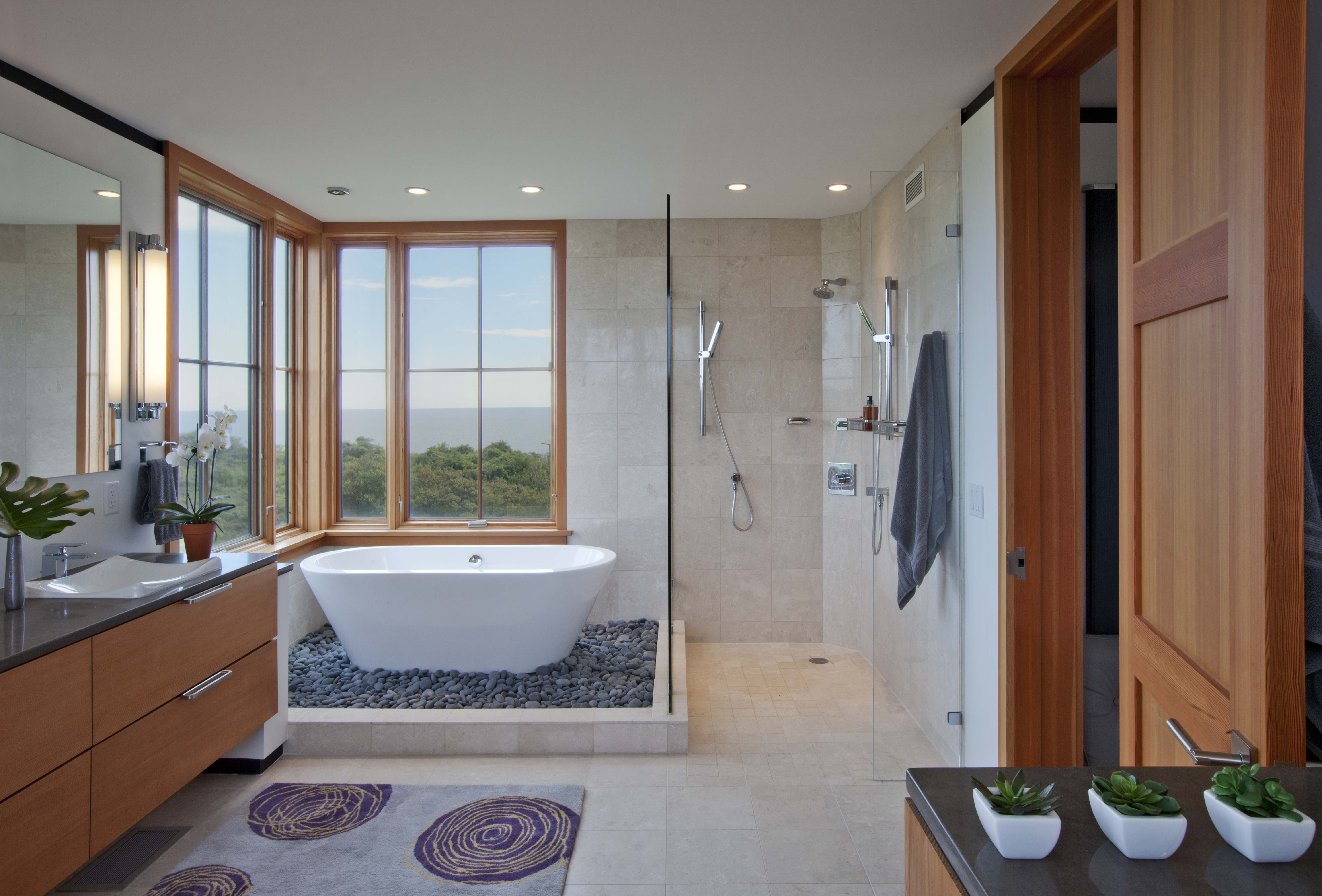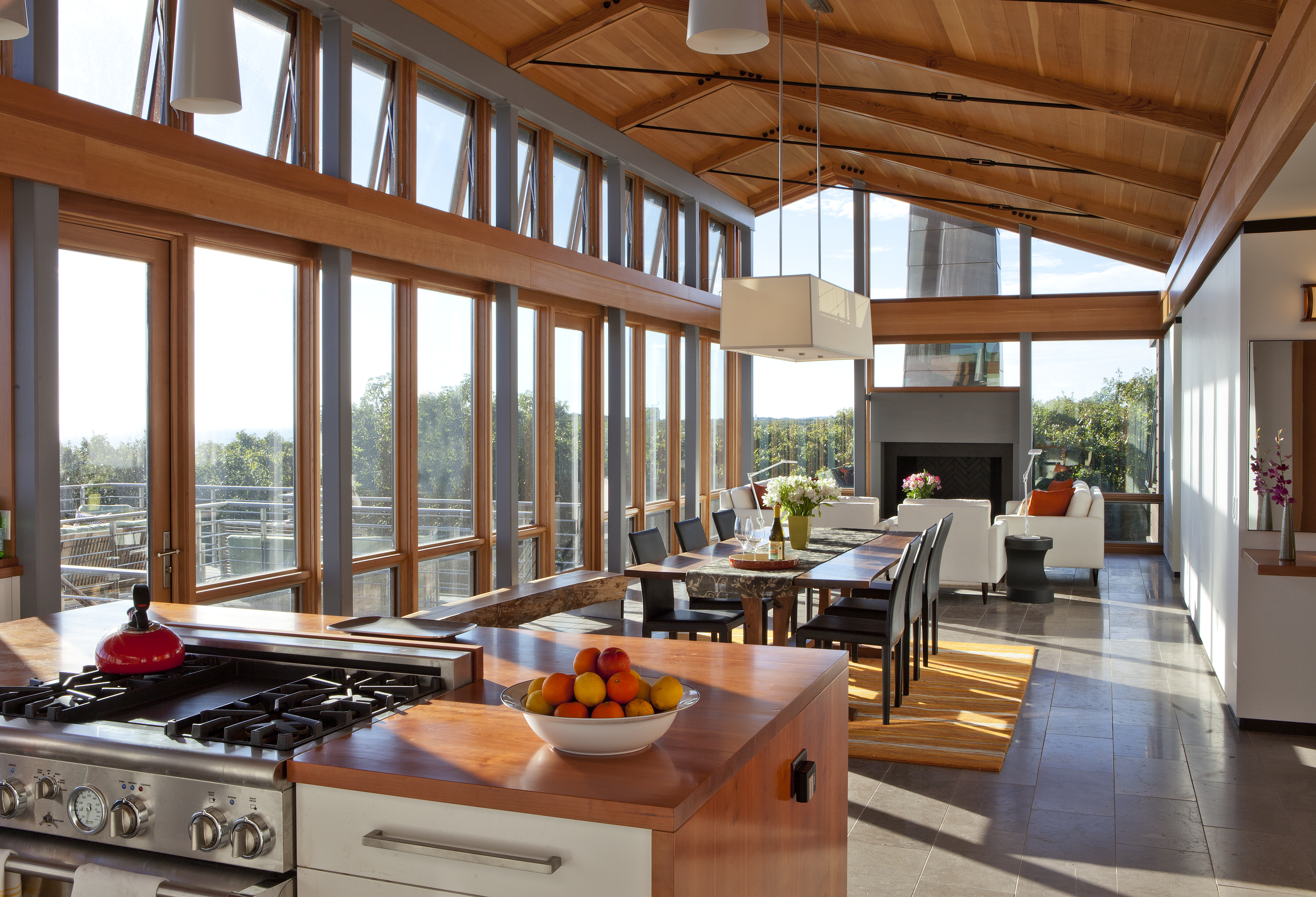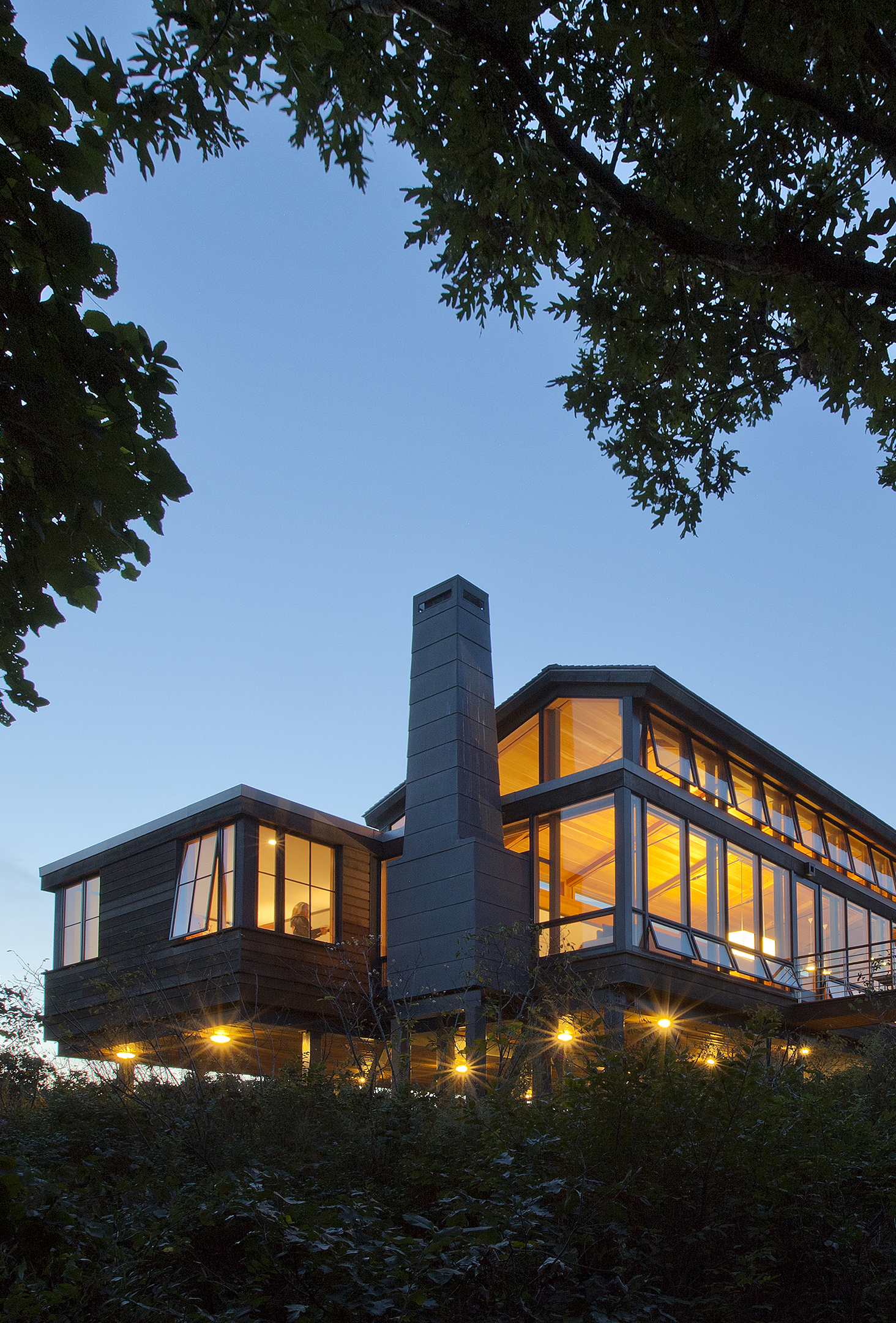For this property hugging a cliff some 140 feet above the Atlantic, the client asked for a “tree house” – a structure set above the canopy of oaks and foliage – with an unobstructed ocean view. The home is zoned into three parallel linear volumes, clad largely in naturally weathered boards, glass, and copper. A long deck, inspired in form by a pontoon outrigger, is connected to the house by three bridges. The design elegantly weaves the legacy of midcentury modern architecture with the romance of the Cape Cod maritime tradition.