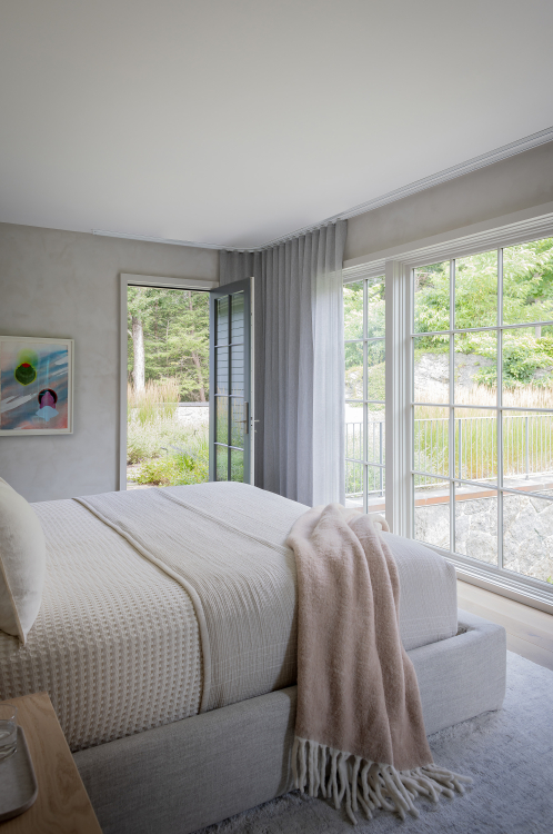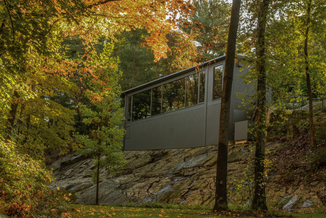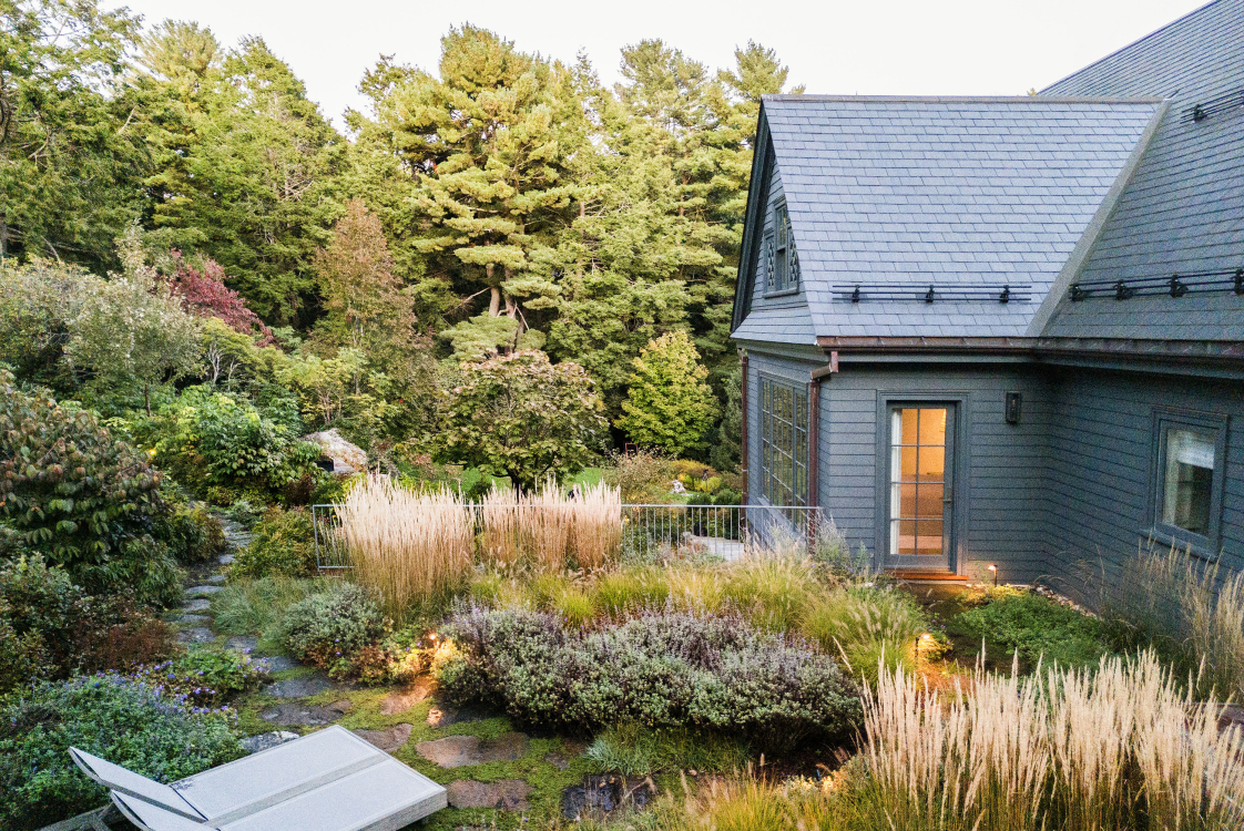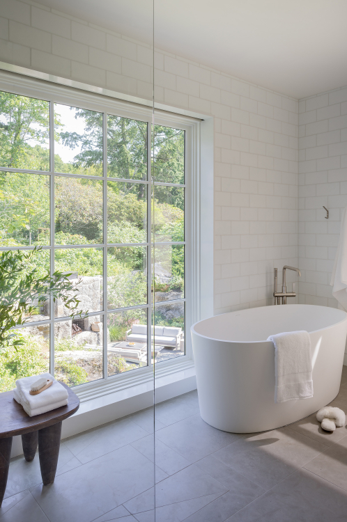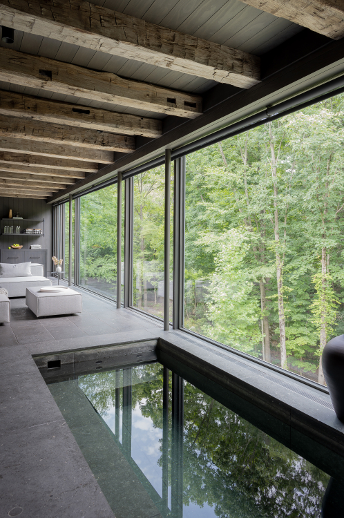 Additionally, a modest garden shed was transformed into a serene spa retreat, carefully integrated into its historic setting. The design team worked within the original footprint—retaining only a brick wall from the shed—to create a structure under 700 square feet that blends seamlessly with the landscape and main house. A 47-foot expanse of glass opens the spa to surrounding trees and gardens, balancing enclosure with connection to nature. Inside, the program includes a heated 12-by-5-foot spa, indoor and outdoor showers, and modest entry and mudroom spaces—crafted for retreat, reflection, and renewal.