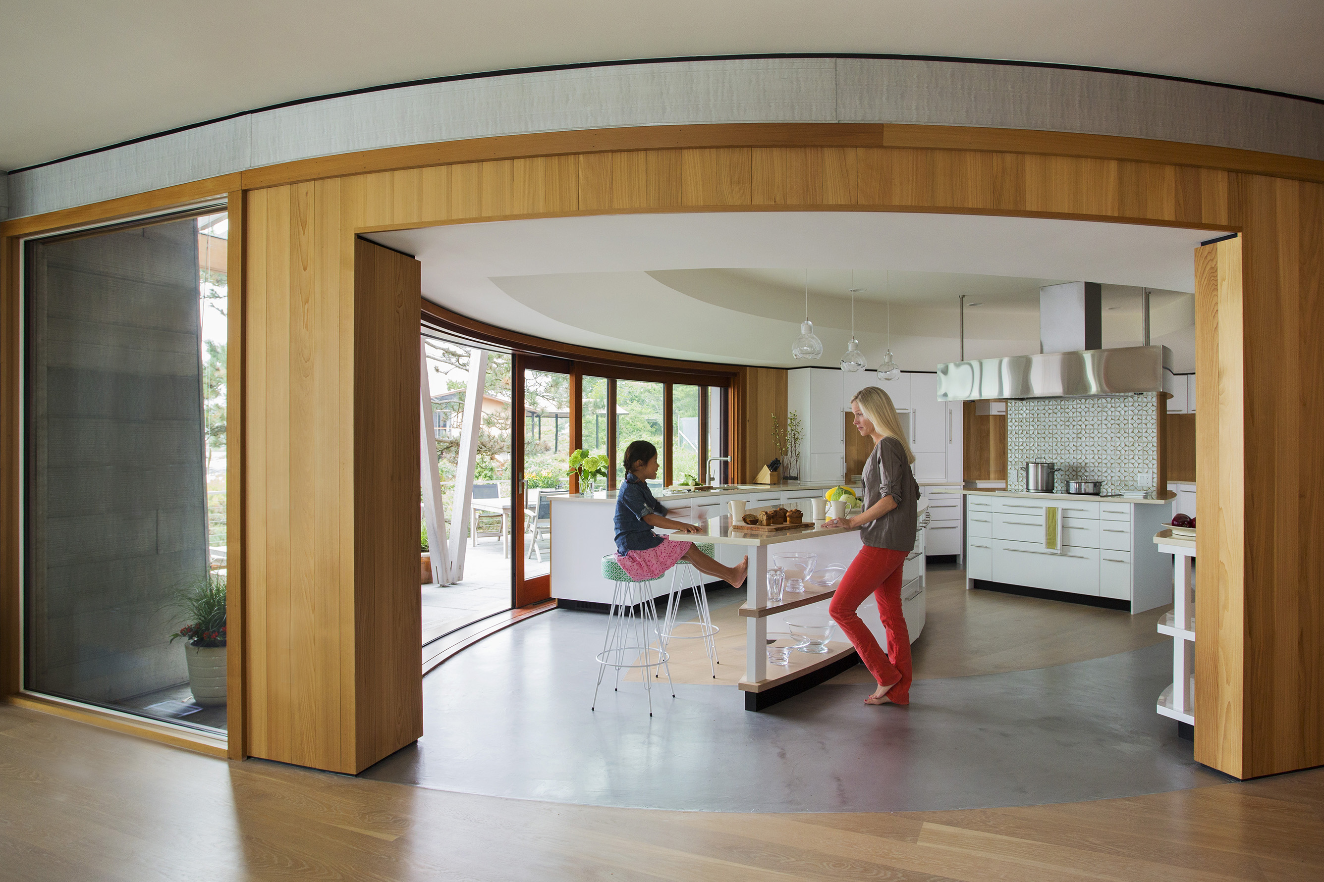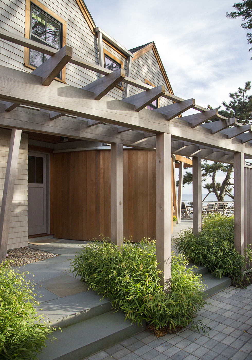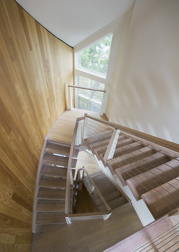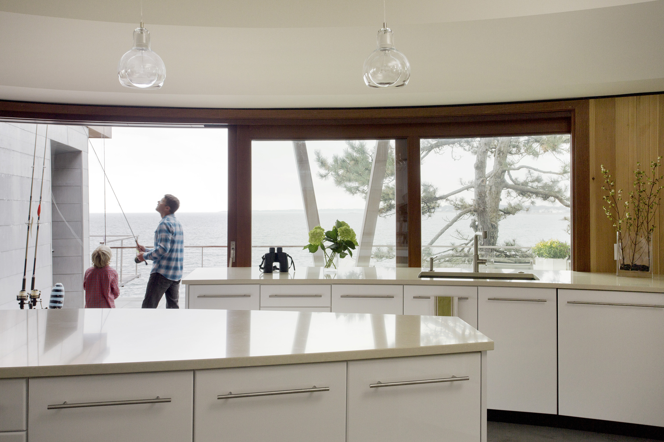 This home on Boston’s north shore makes the most of multi-generational living in a pristine location. The main house features multiple living and play areas, office space, and five bedrooms to accommodate the dynamic needs of a young family. A garden level in-law suite functions independently with abundant natural light, ventilation and water views. The almond-shaped form of the kitchen mimics the natural contours of the shoreline beyond, while hinting at the site’s fishing heritage. Custom curved sliding doors open the kitchen on one side to an elevated deck that invites connection with the ocean. Battered walls in natural wood on the building’s exterior reflect fish-drying racks that littered the coast of the north shore in the past. A brise-soleil provides shade in summer while allowing the winter sun to penetrate deep into the house.