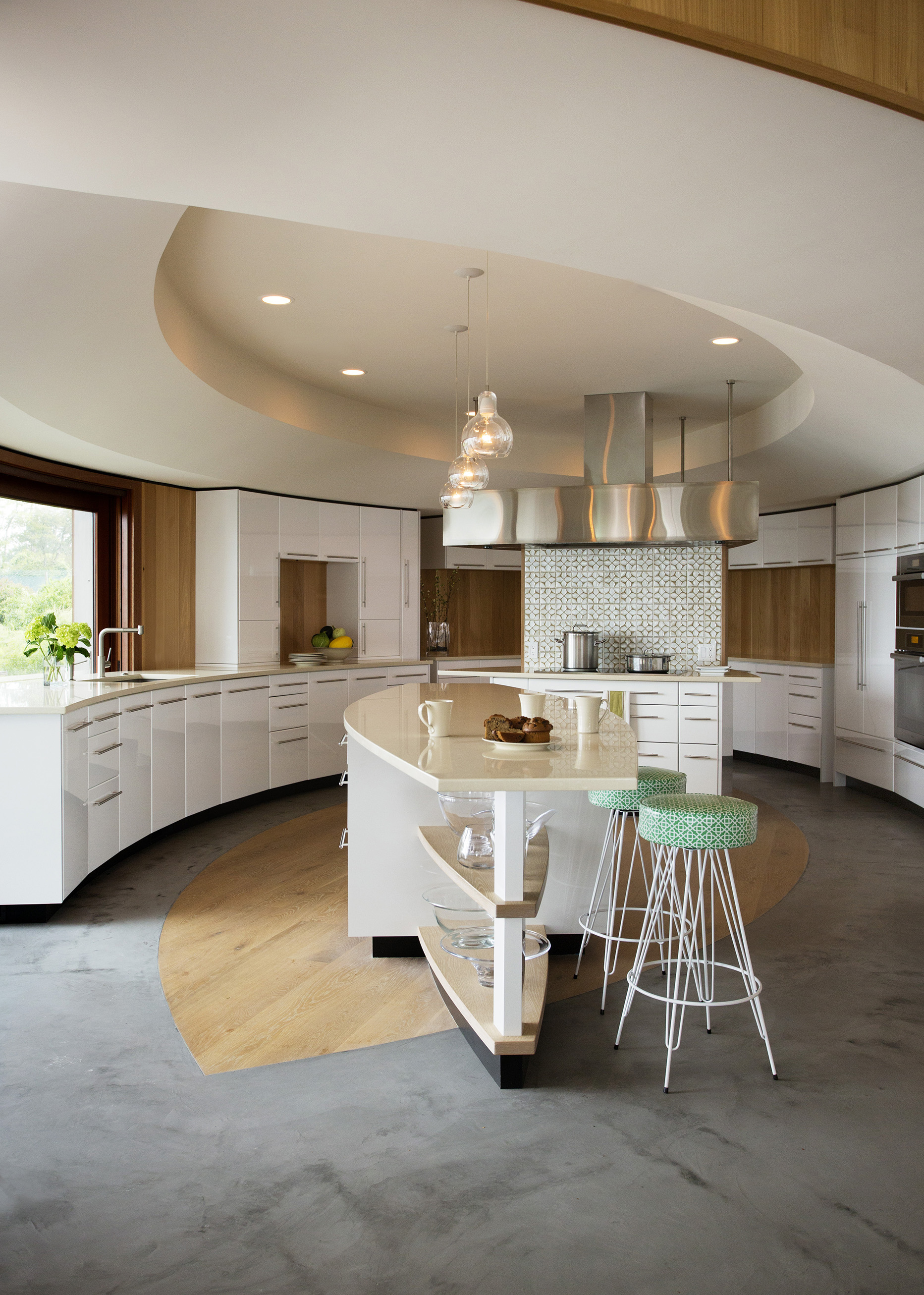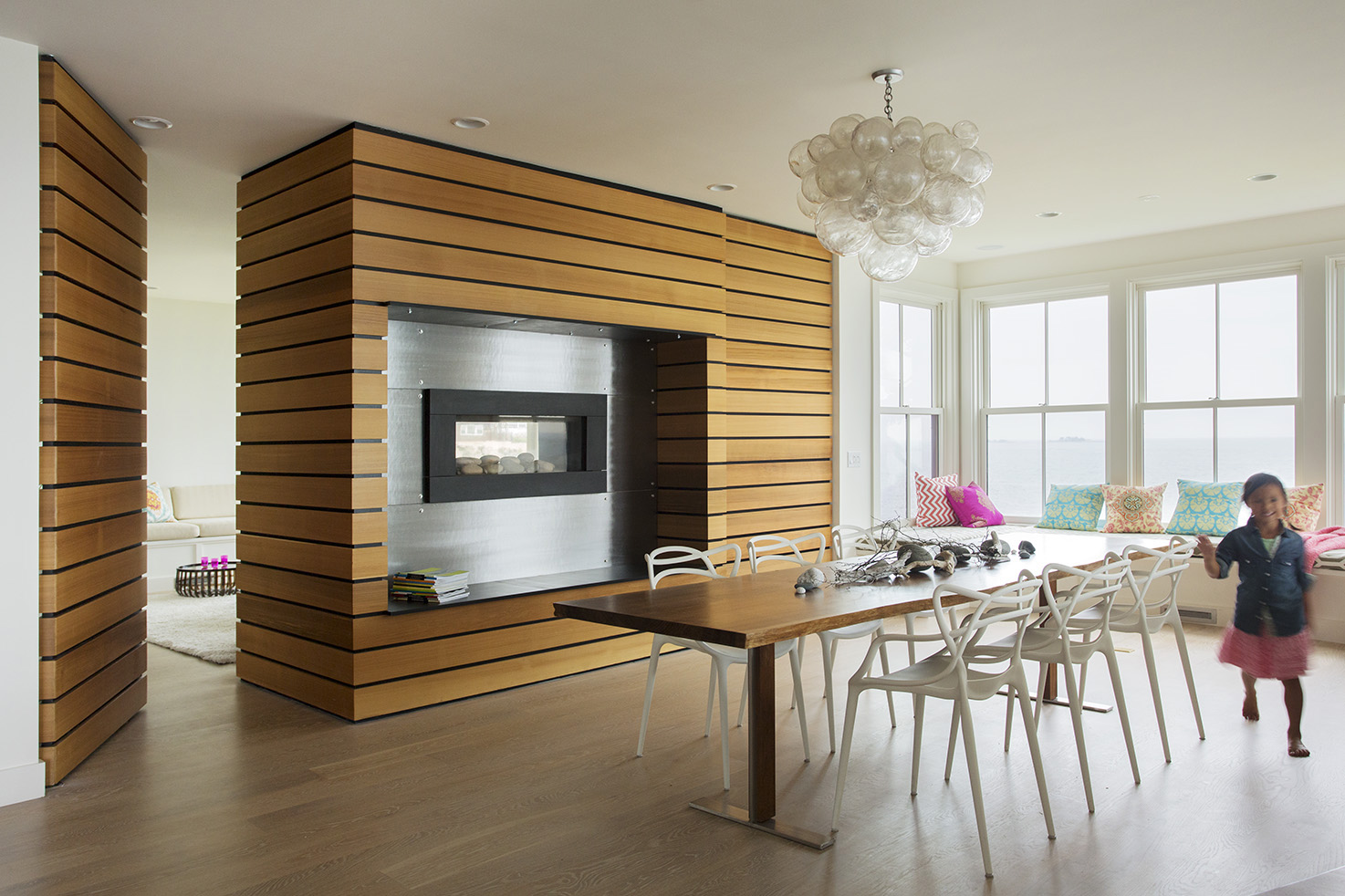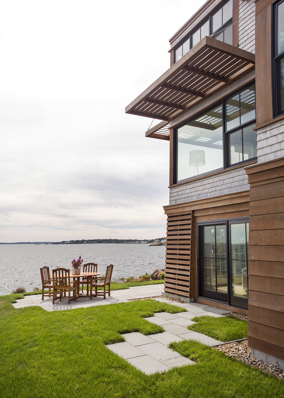 This home on Boston’s north shore makes the most of multi-generational living in a pristine location. The main house features multiple living and play areas, office space, and five bedrooms to accommodate the dynamic needs of a young family. A garden level in-law suite functions independently with abundant natural light, ventilation and water views. The almond-shaped form of the kitchen mimics the natural contours of the shoreline beyond, while hinting at the site’s fishing heritage. Custom curved sliding doors open the kitchen on one side to an elevated deck that invites connection with the ocean. Battered walls in natural wood on the building’s exterior reflect fish-drying racks that littered the coast of the north shore in the past. A brise-soleil provides shade in summer while allowing the winter sun to penetrate deep into the house.