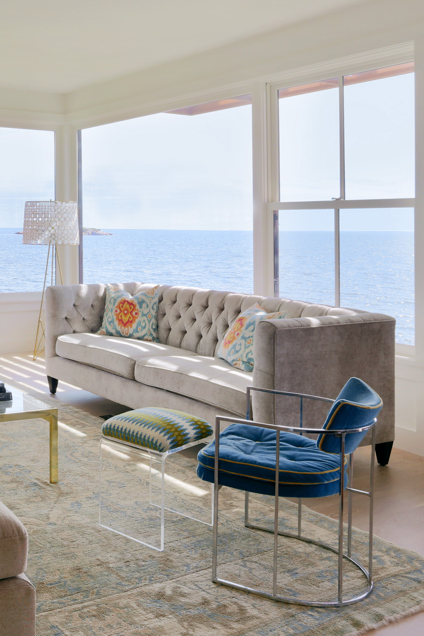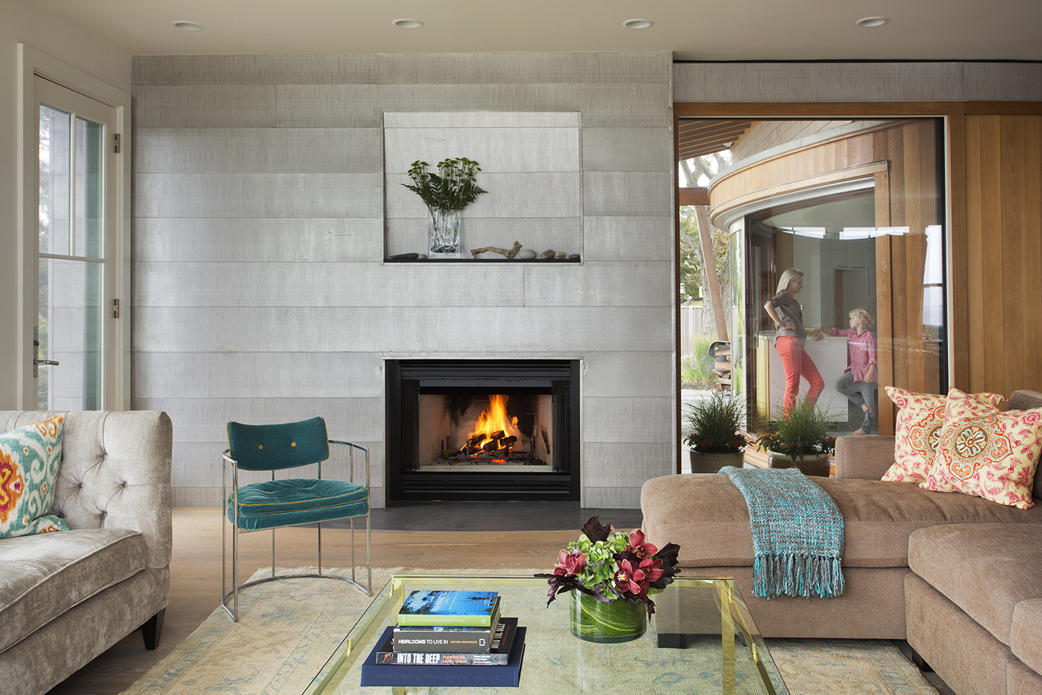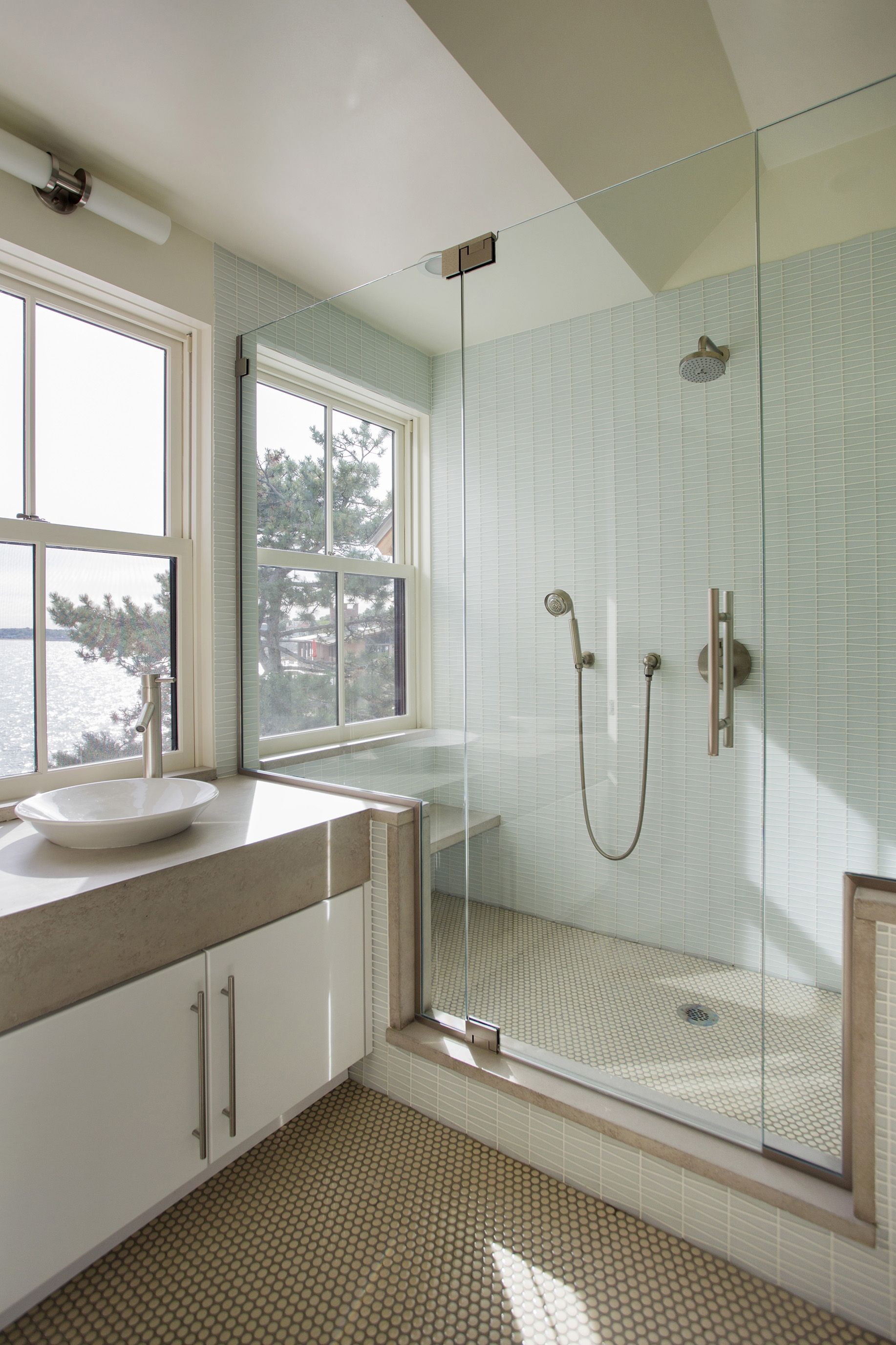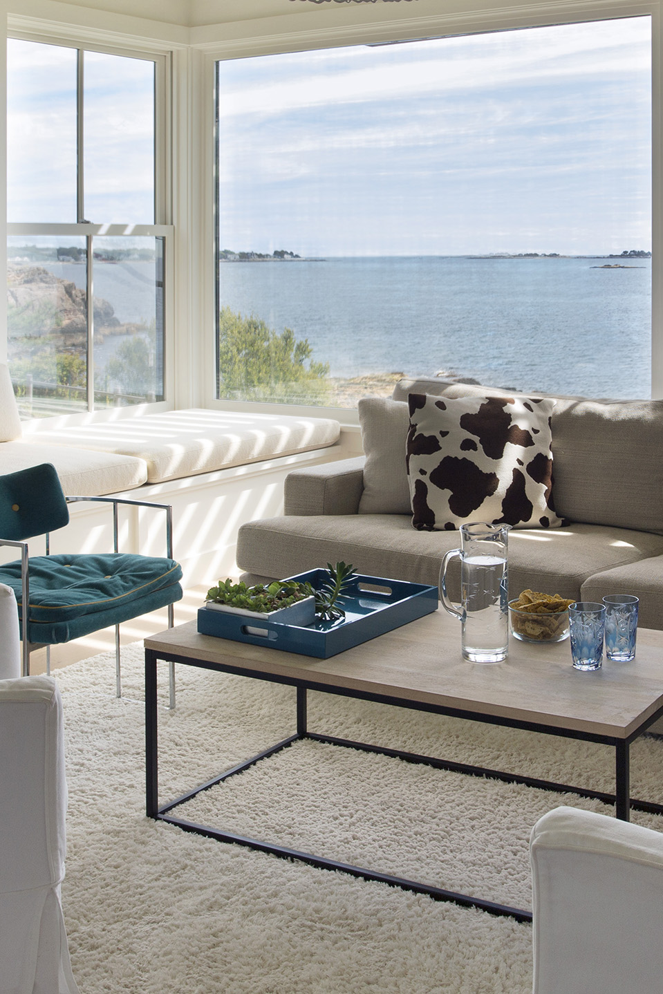 This home on Boston’s north shore makes the most of multi-generational living in a pristine location. The main house features multiple living and play areas, office space, and five bedrooms to accommodate the dynamic needs of a young family. A garden level in-law suite functions independently with abundant natural light, ventilation and water views. The almond-shaped form of the kitchen mimics the natural contours of the shoreline beyond, while hinting at the site’s fishing heritage. Custom curved sliding doors open the kitchen on one side to an elevated deck that invites connection with the ocean. Battered walls in natural wood on the building’s exterior reflect fish-drying racks that littered the coast of the north shore in the past. A brise-soleil provides shade in summer while allowing the winter sun to penetrate deep into the house.