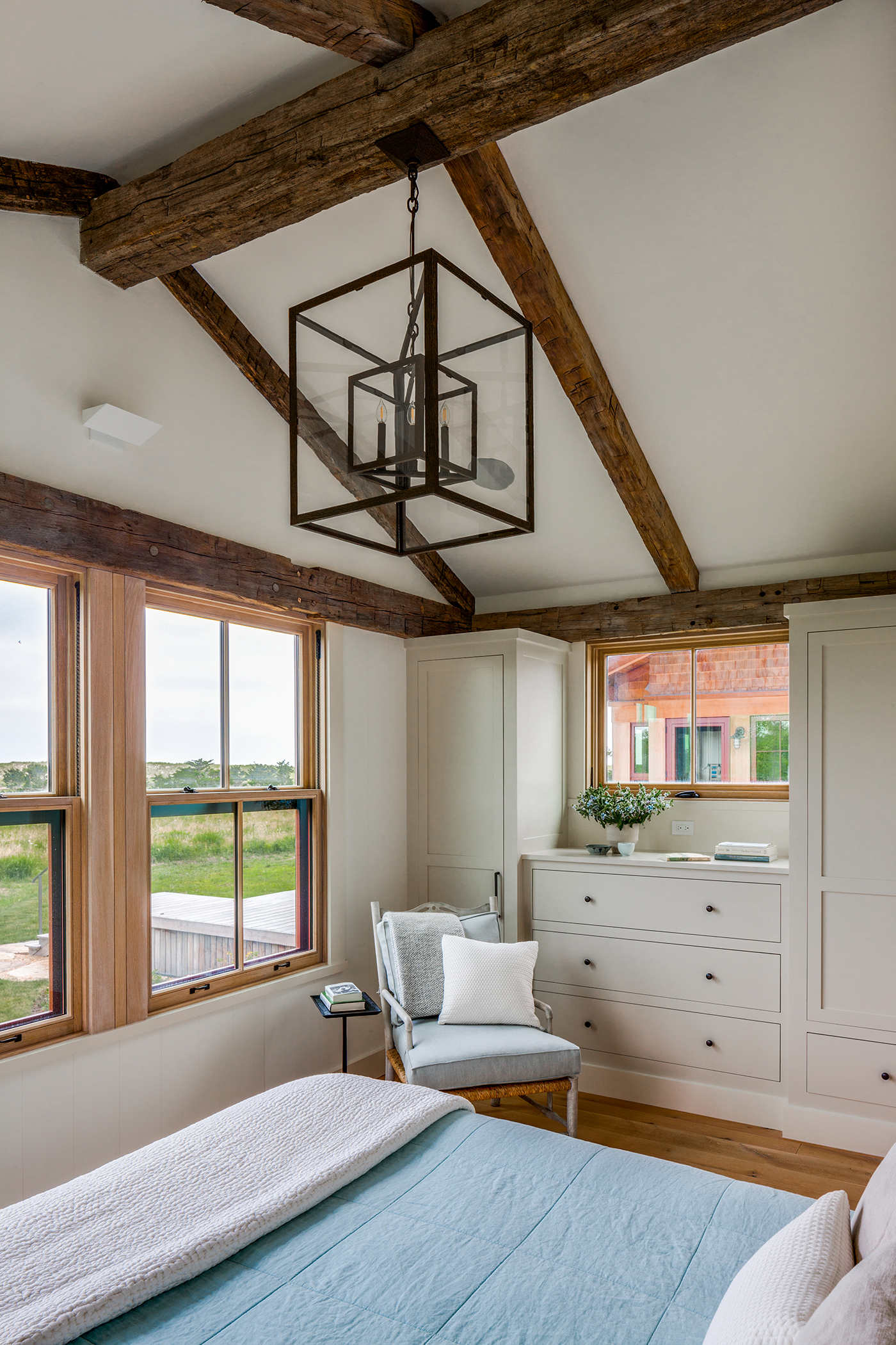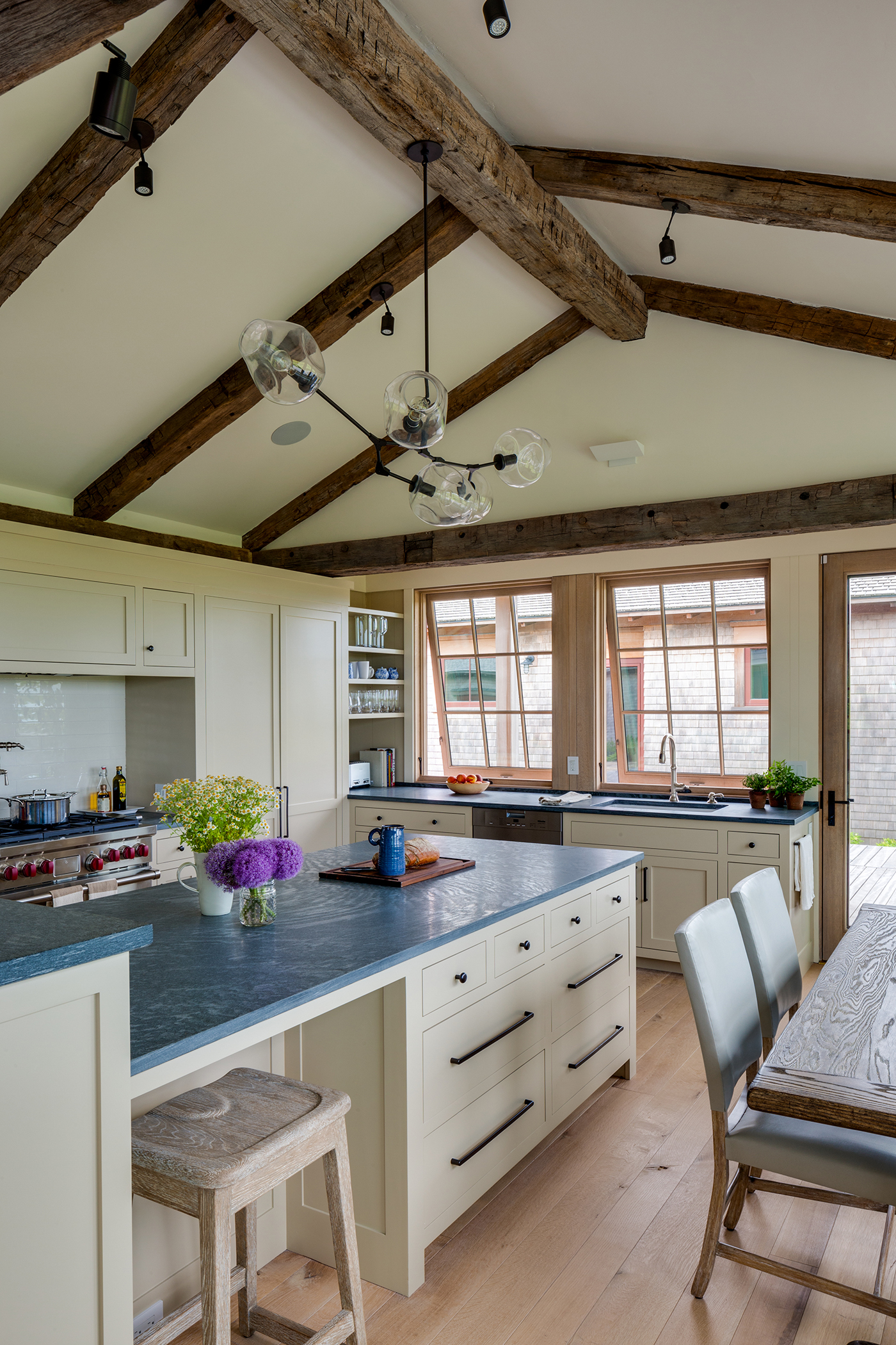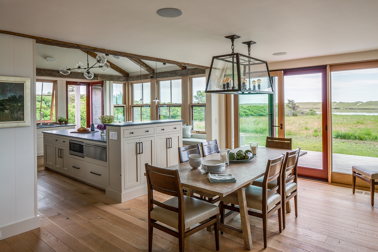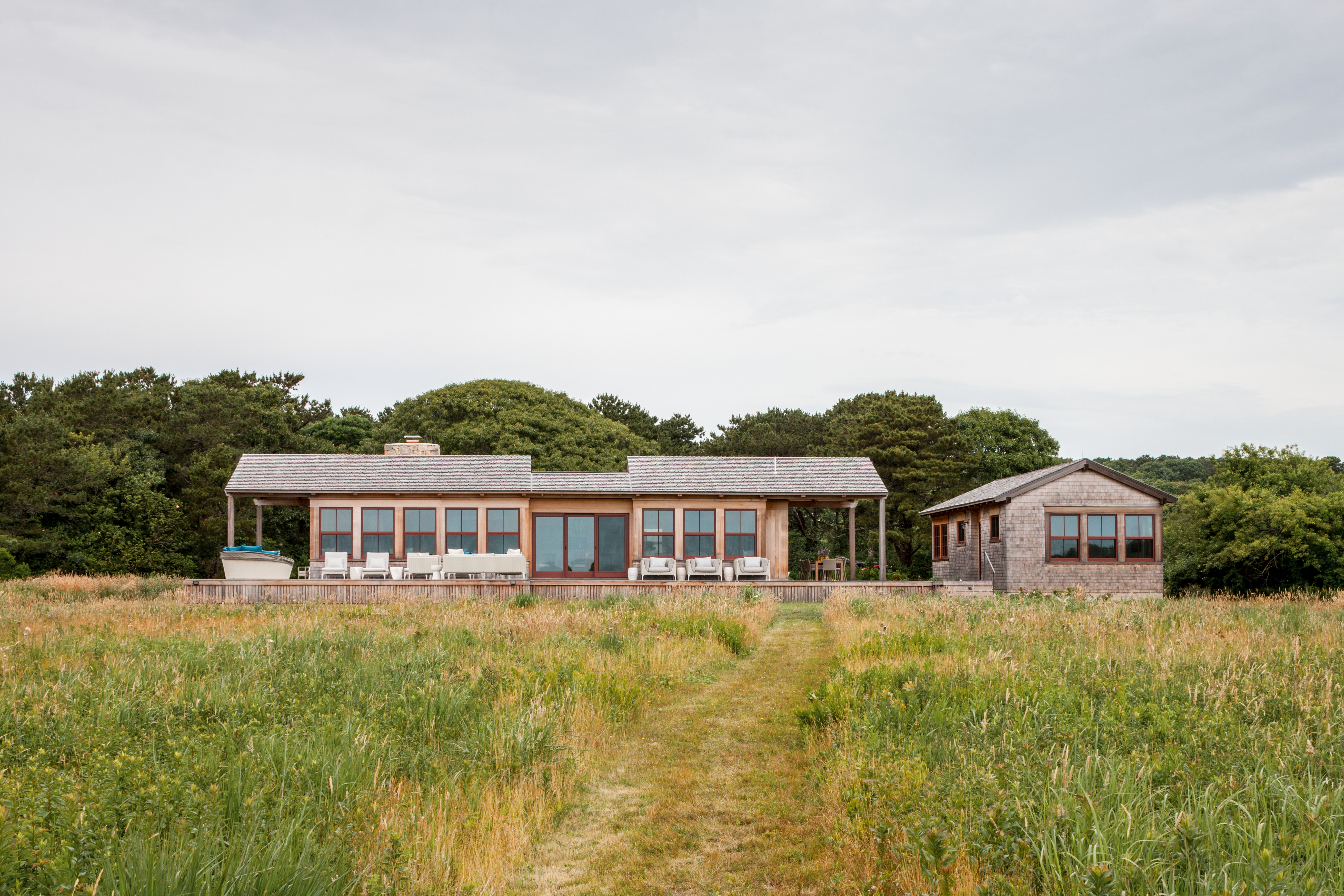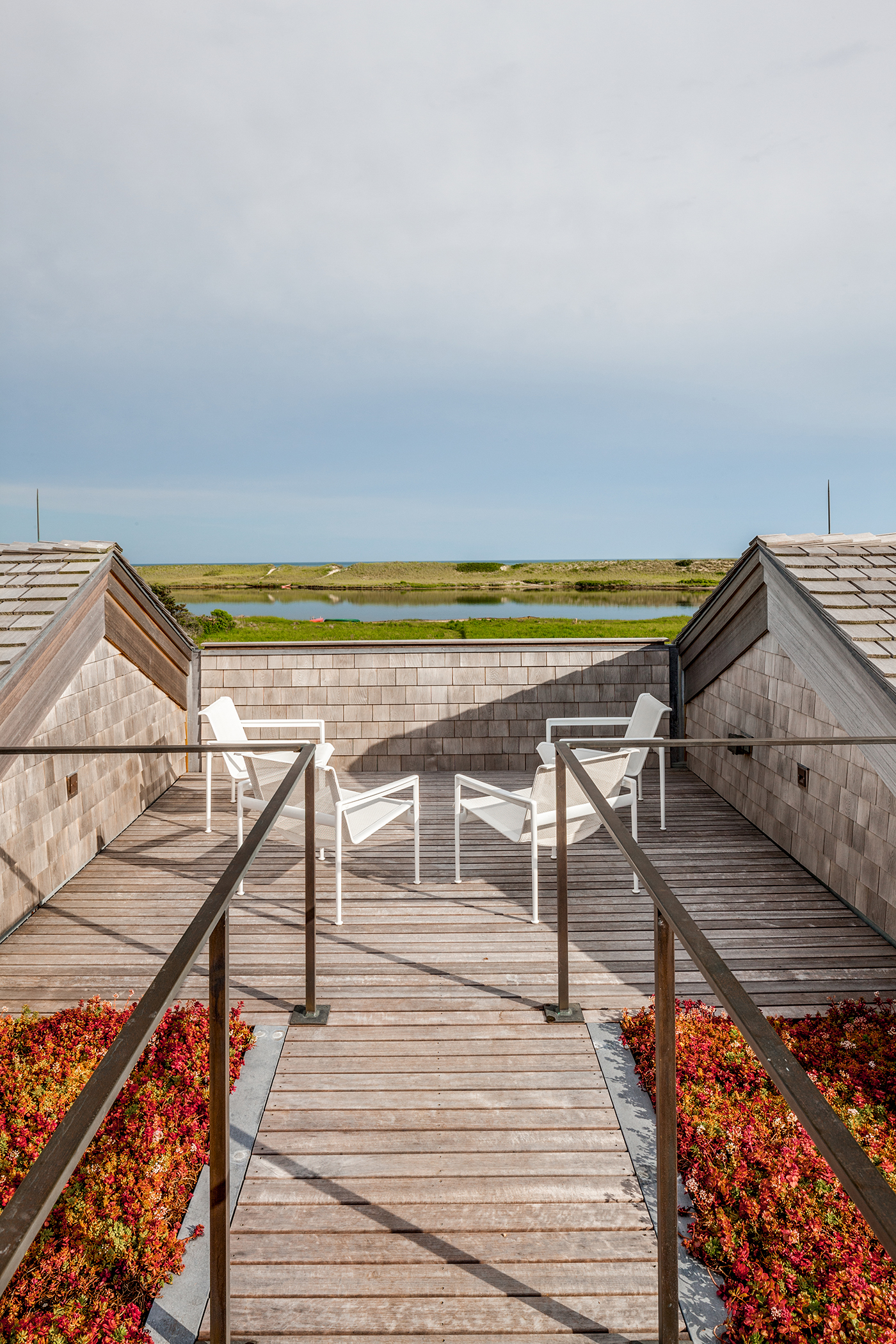 This home, overlooking a saltwater pond and barrier beach with the Atlantic Ocean beyond, had once been the site of an old fishing and hunting camp. Its new owners aimed to create a comfortable family getaway that preserved the essence of the property’s unique history. Working with Hutker Architects, they arrived at a design for a modern beach camp. The main building contains common living and dining areas, as well as a bedroom wing, while the master suite (with private study) is housed in a separate cabin. Throughout the interiors, rough-hewn timbers frame a simple palette of natural materials, selected with the inevitability of harsh sunlight and sandy feet in mind. All structures are raised several feet above grade, perched on a boardwalk that provides circulation between and around the buildings, and via an outdoor stair to a lookout on the roof. Natural cedar and a green roof help to minimize visual disruption between the house and its natural environment, while the simple gabled structures are a nod to the property’s roots.