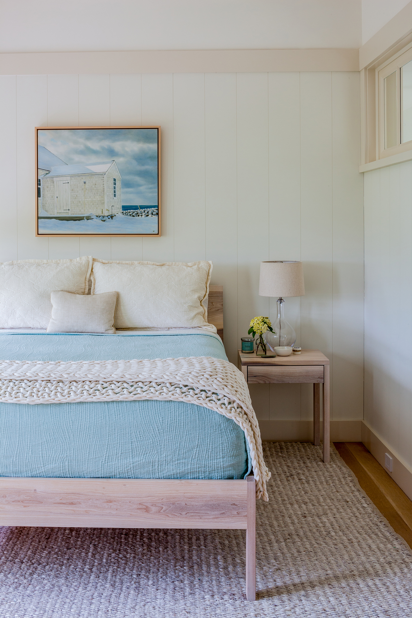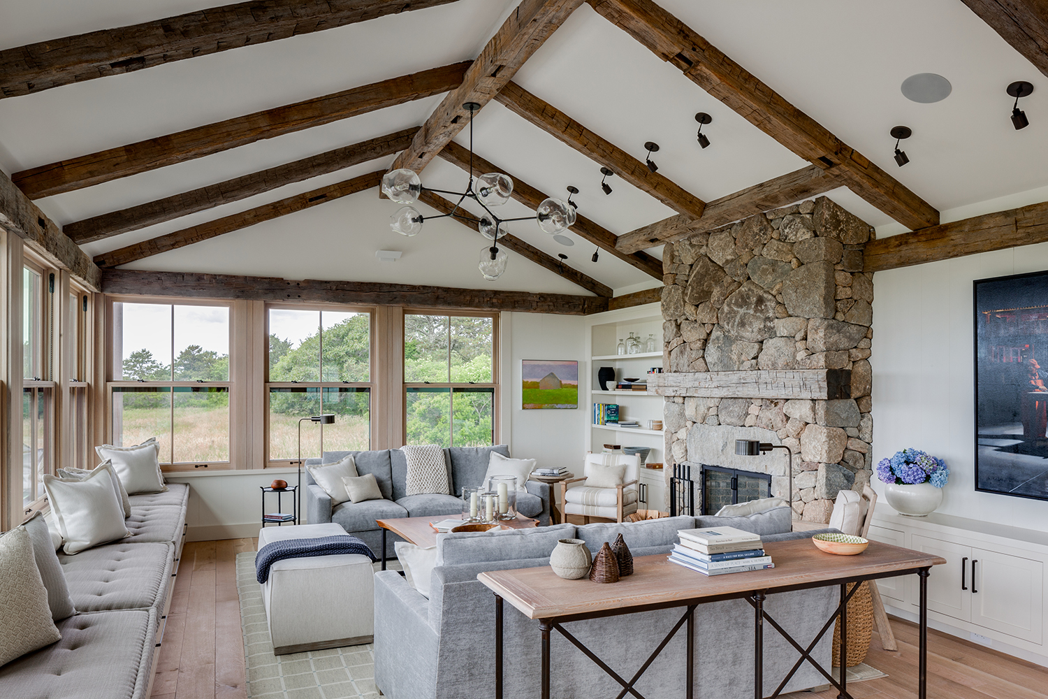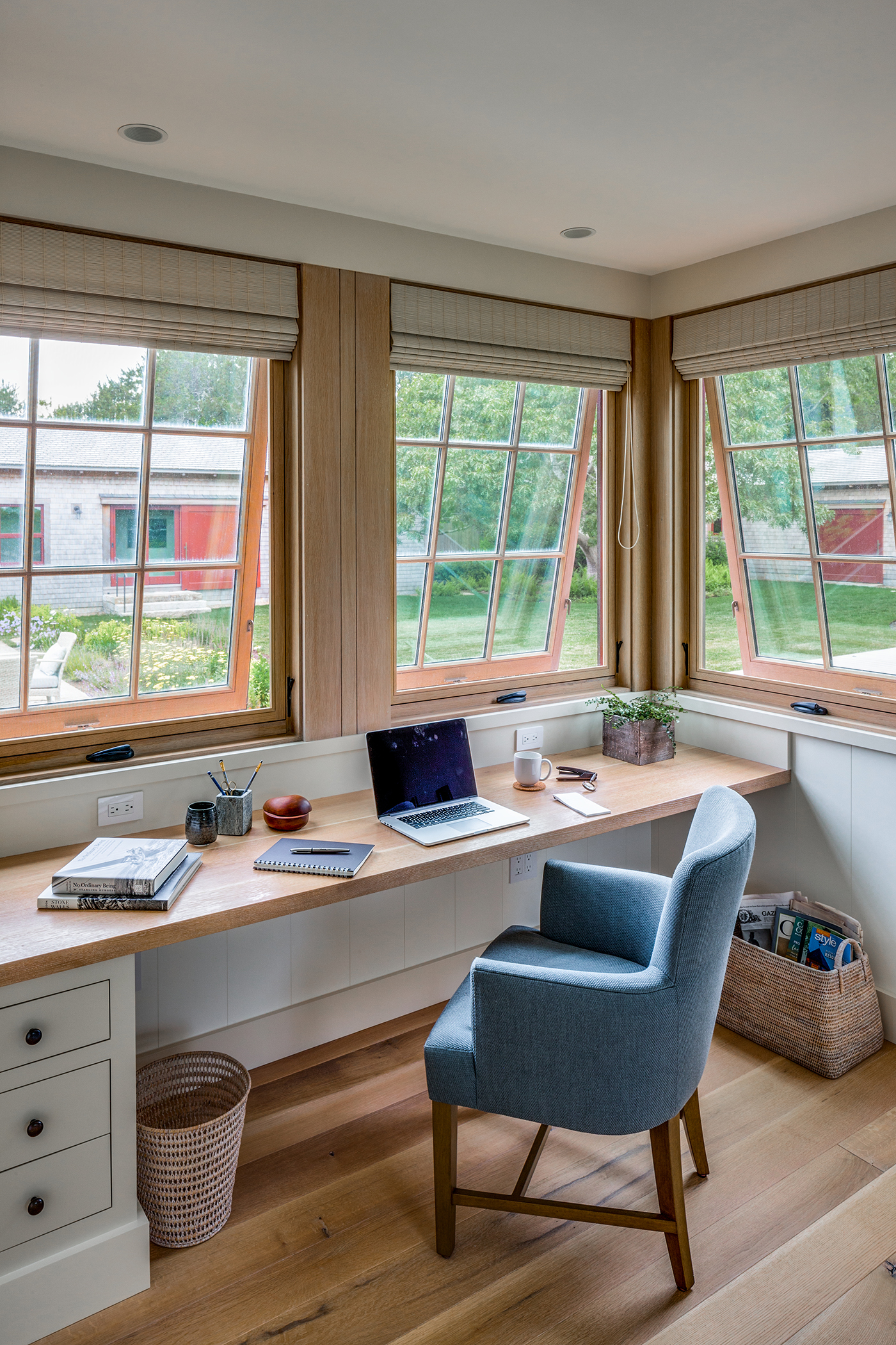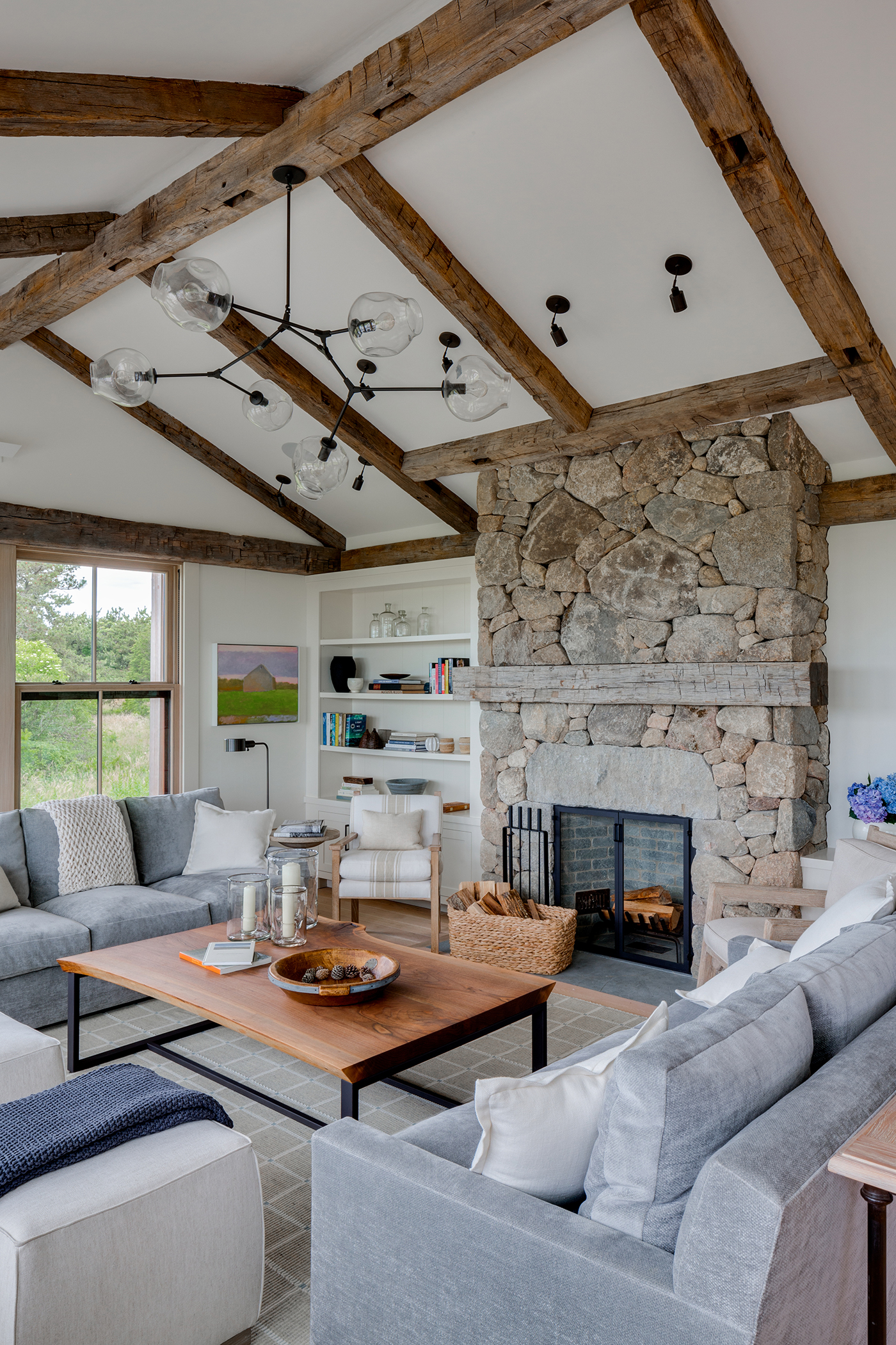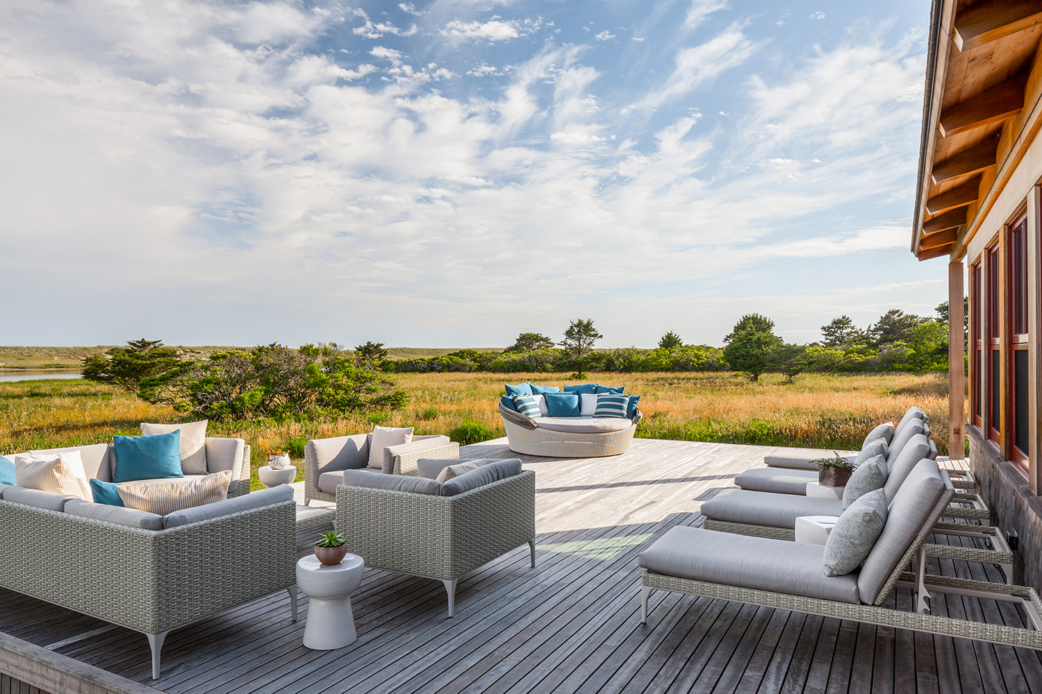 This home, overlooking a saltwater pond and barrier beach with the Atlantic Ocean beyond, had once been the site of an old fishing and hunting camp. Its new owners aimed to create a comfortable family getaway that preserved the essence of the property’s unique history. Working with Hutker Architects, they arrived at a design for a modern beach camp. The main building contains common living and dining areas, as well as a bedroom wing, while the master suite (with private study) is housed in a separate cabin. Throughout the interiors, rough-hewn timbers frame a simple palette of natural materials, selected with the inevitability of harsh sunlight and sandy feet in mind. All structures are raised several feet above grade, perched on a boardwalk that provides circulation between and around the buildings, and via an outdoor stair to a lookout on the roof. Natural cedar and a green roof help to minimize visual disruption between the house and its natural environment, while the simple gabled structures are a nod to the property’s roots.