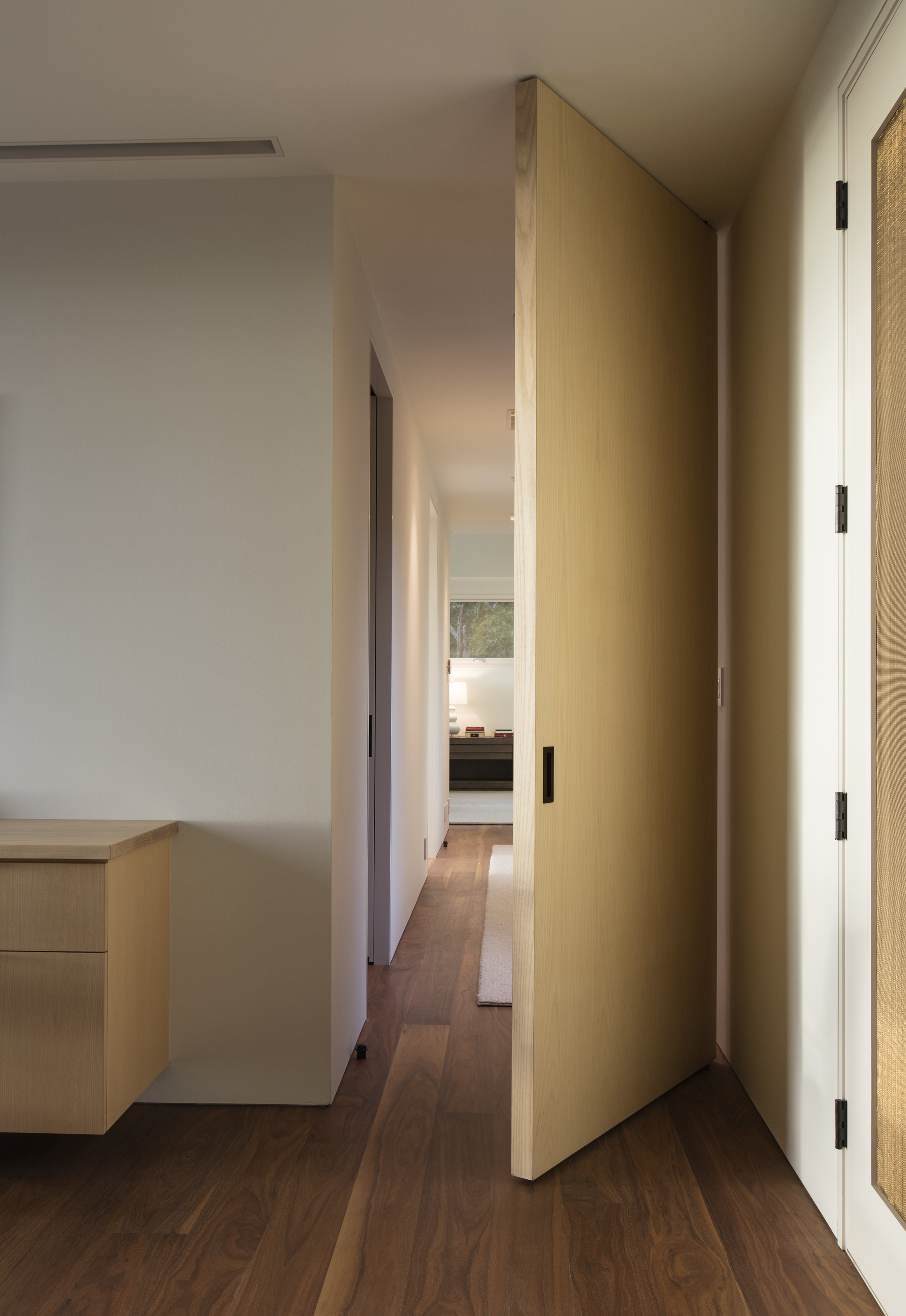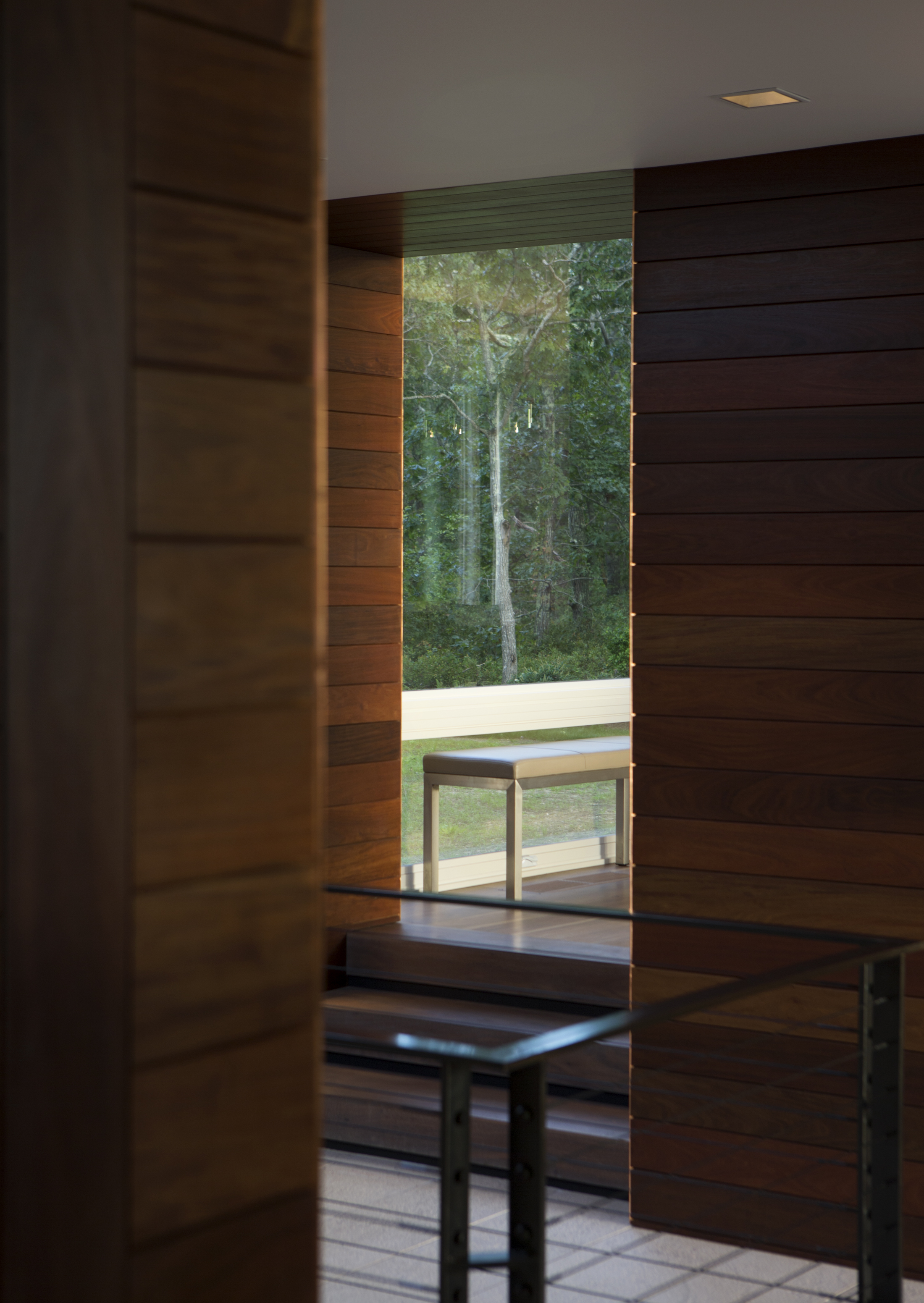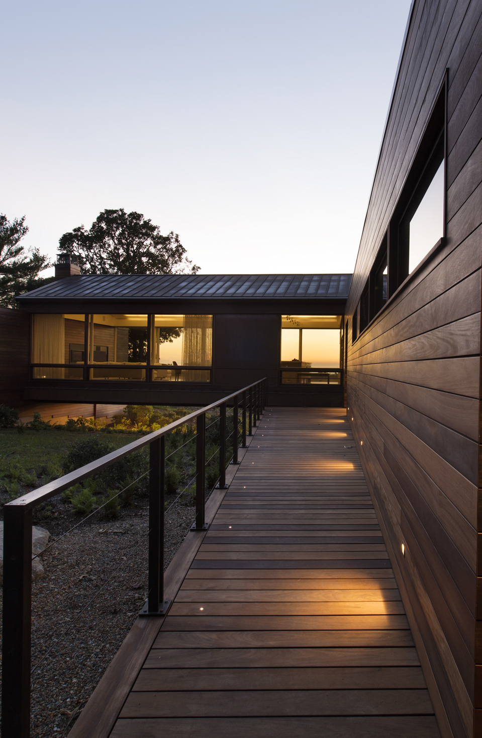 On a hill overlooking the Atlantic, this modern home is designed to maximize experience of the outdoors at every turn. Our team created a concept that would elevate this space in a gabled glass bridge suspended between flat roofed guest and entry wings. Simple materials; oiled ipe wood and bronze, punctuate its geometric forms which are scaled to be in harmony with the home’s natural surroundings.