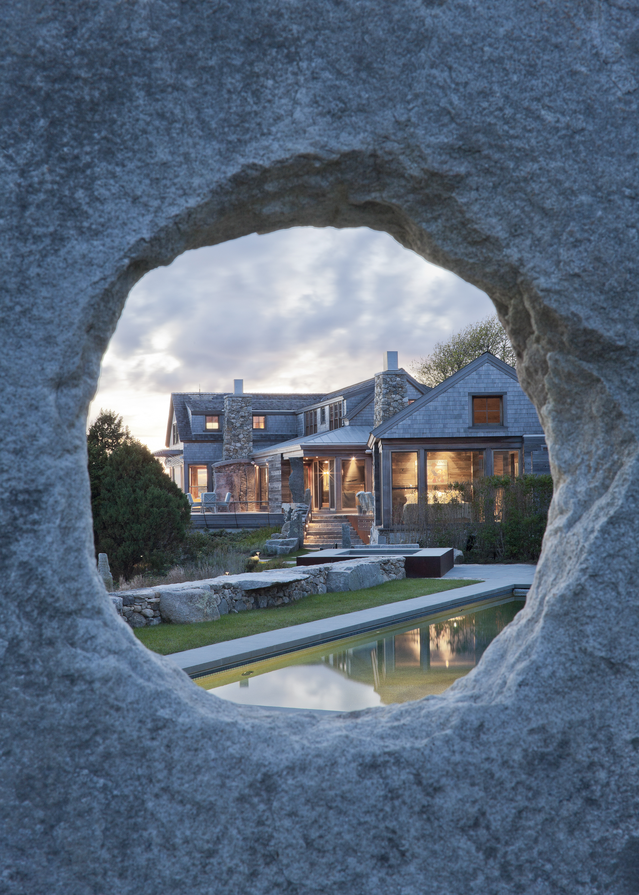 As its name suggests, this home is perched high on a bluff overlooking Edgartown Harbor. A family retreat reminiscent of a European hilltop village, the main house connects to outbuildings, pool, and private dock below through a series of rustic foot paths, gardens, and landscape features. Details within and without were designed to highlight the organic shapes and textures of natural materials, perhaps most notably in the home’s outdoor pool grotto and in its living room fireplace, which appears to have been pieced together from twigs, pebbles, and branches gathered from the surrounding woods.
