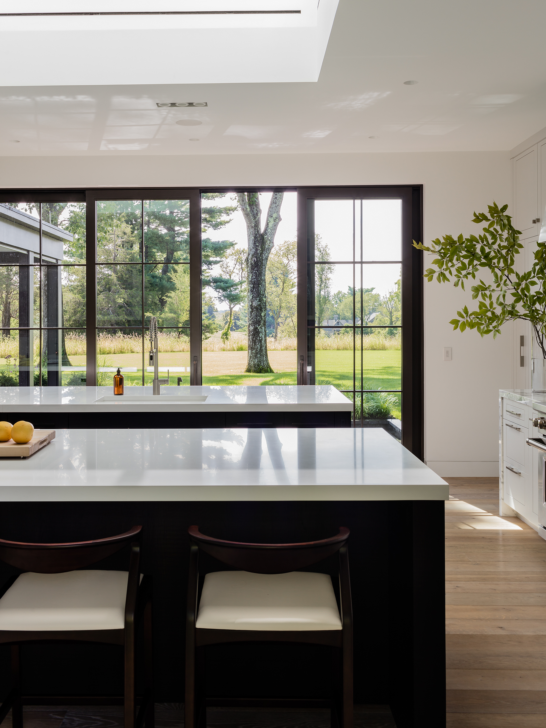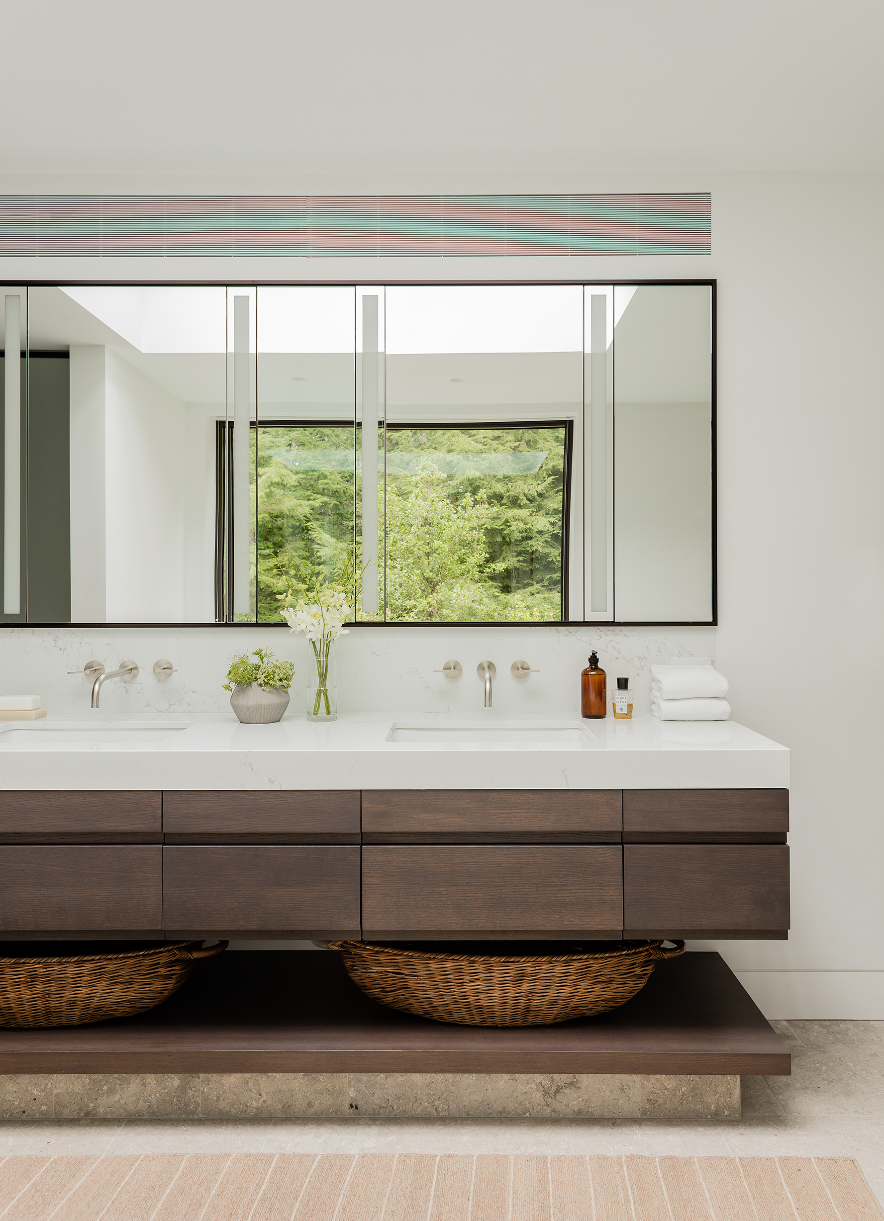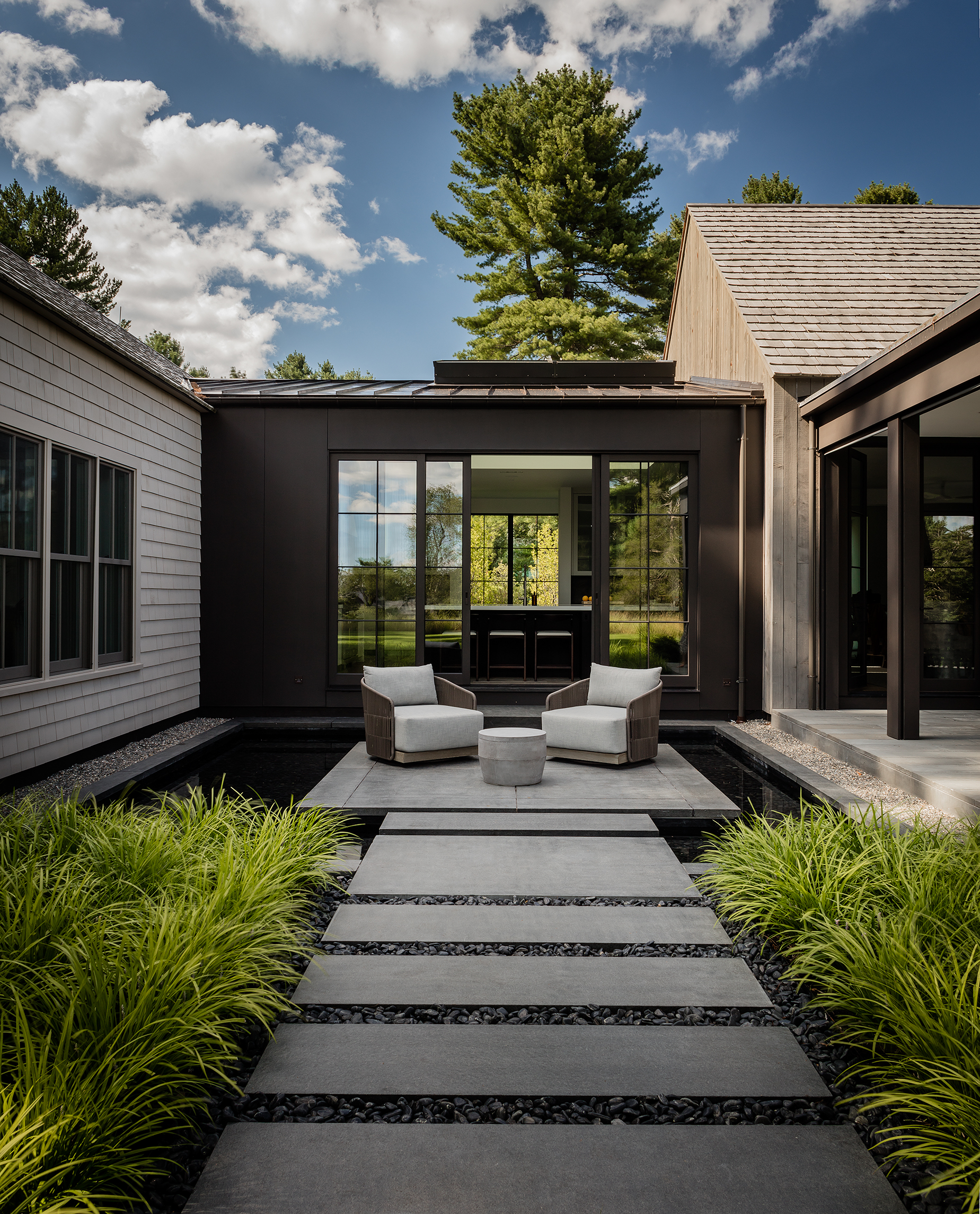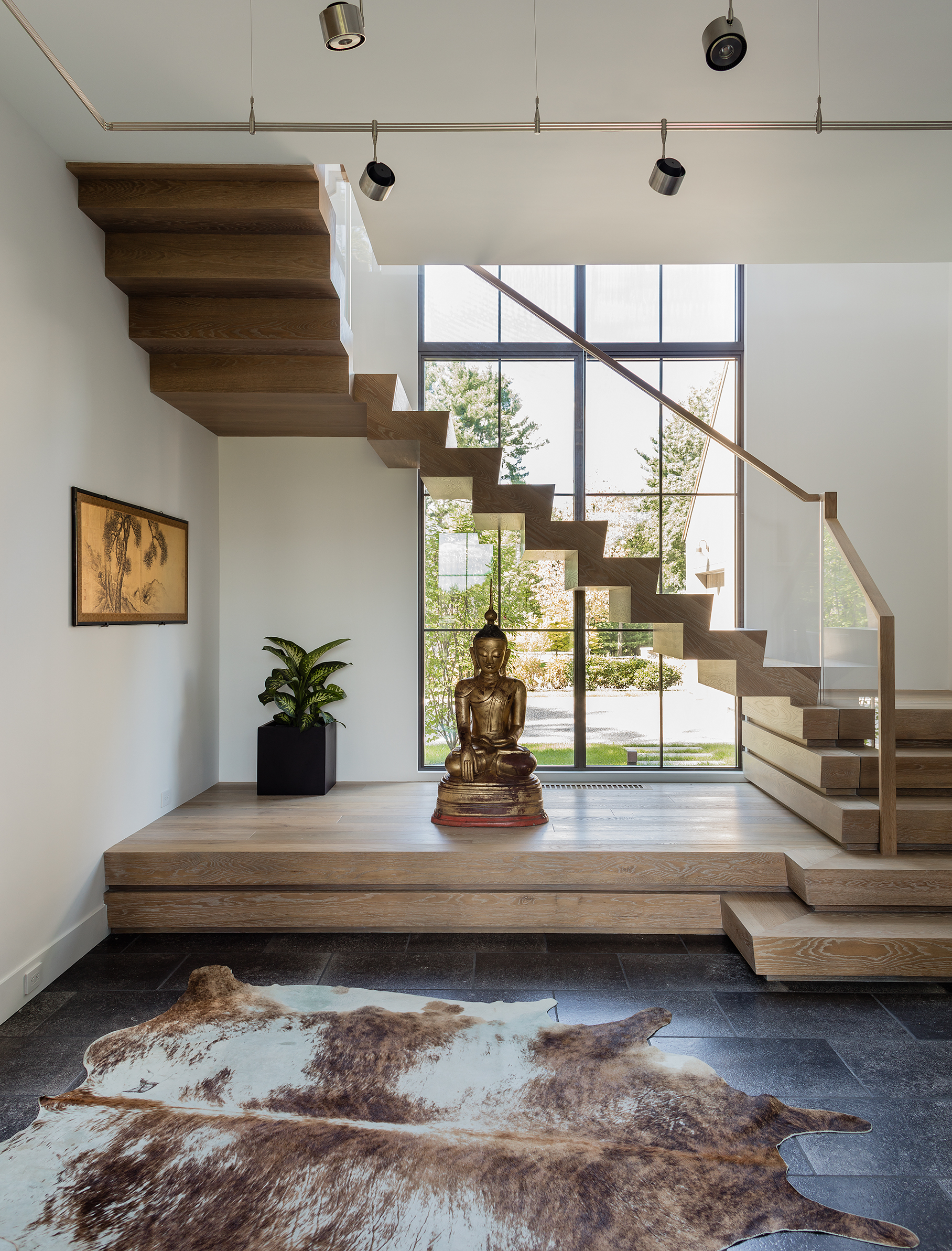 This home was designed to connect seamlessly with the outdoors while providing ample space to display a family’s incredible collection of contemporary art. Additionally, the clients wished for ample gathering spaces in the living and kitchen areas to spend time with their extended family. From entry, a gallery corridor runs the full width of the home, allowing for unobstructed viewing of paintings and sculpture while creating a circulation spine along which the home’s public and private spaces are aligned. Over-sized windows, skylights, and a water feature adjacent to the kitchen encourage frequent enjoyment of the home’s spectacular woodland setting.