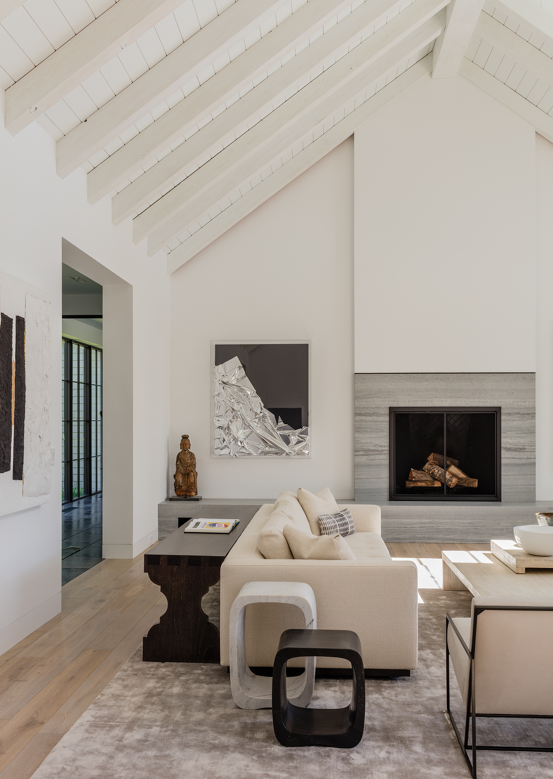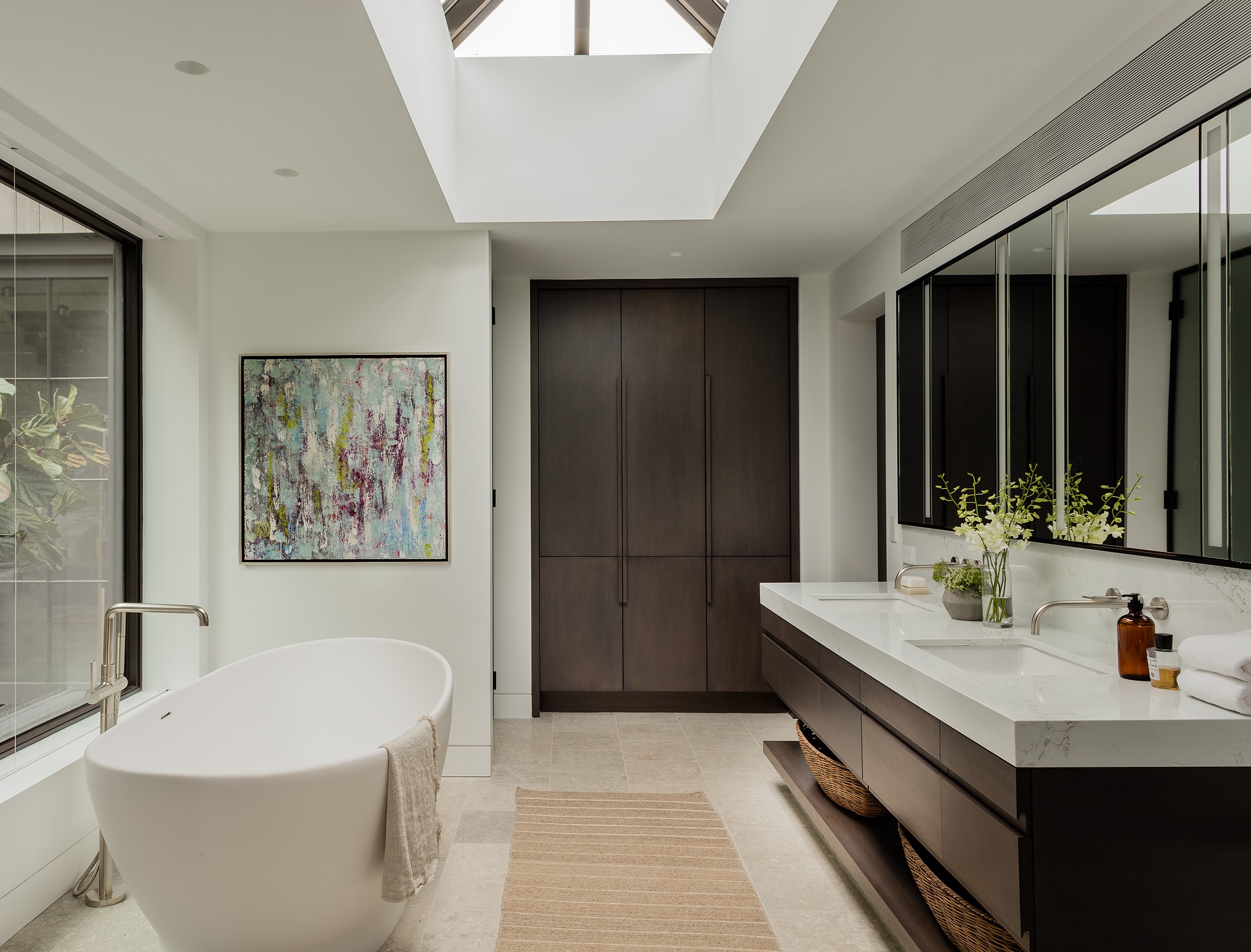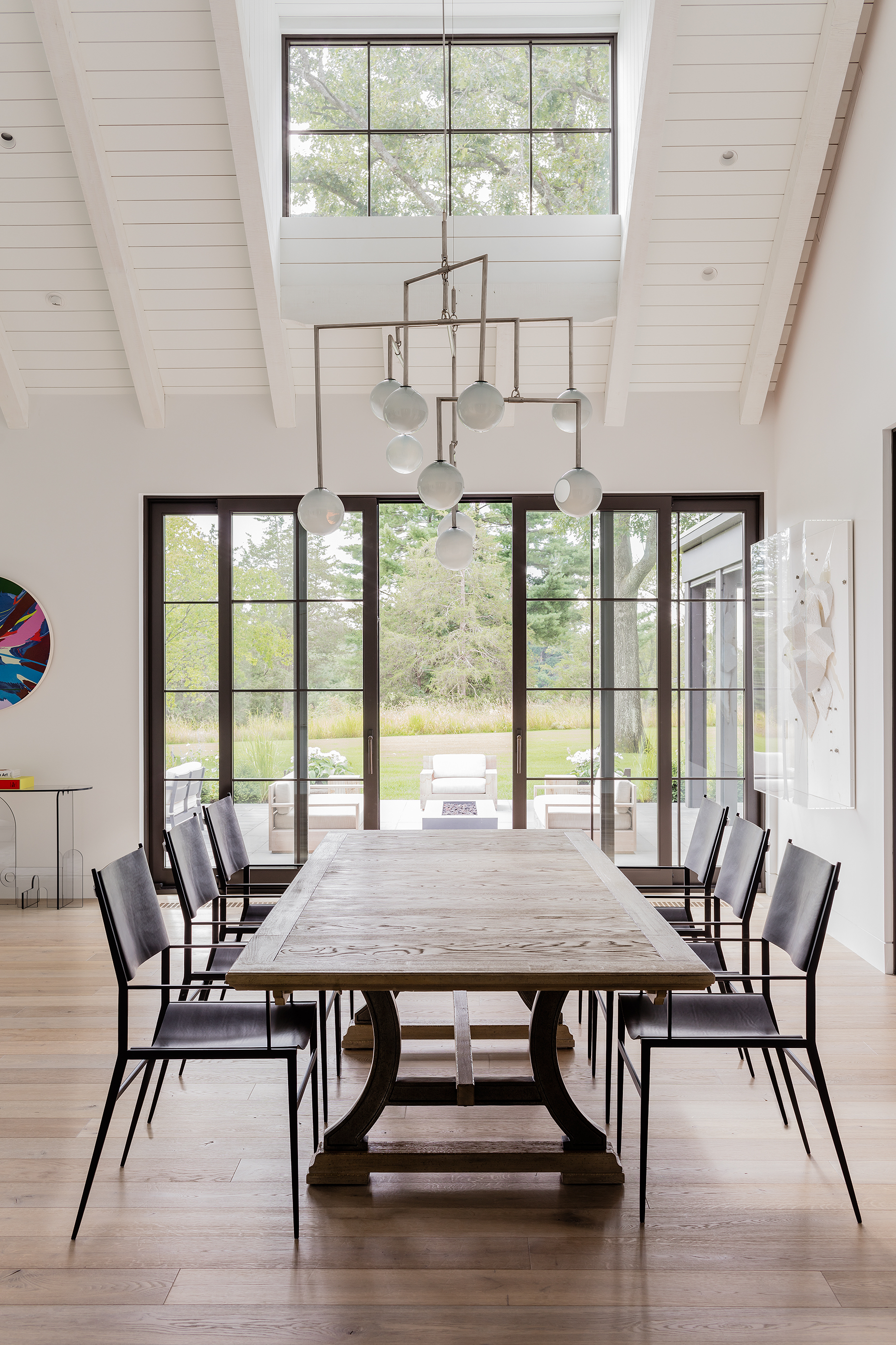 This home was designed to connect seamlessly with the outdoors while providing ample space to display a family’s incredible collection of contemporary art. Additionally, the clients wished for ample gathering spaces in the living and kitchen areas to spend time with their extended family. From entry, a gallery corridor runs the full width of the home, allowing for unobstructed viewing of paintings and sculpture while creating a circulation spine along which the home’s public and private spaces are aligned. Over-sized windows, skylights, and a water feature adjacent to the kitchen encourage frequent enjoyment of the home’s spectacular woodland setting.